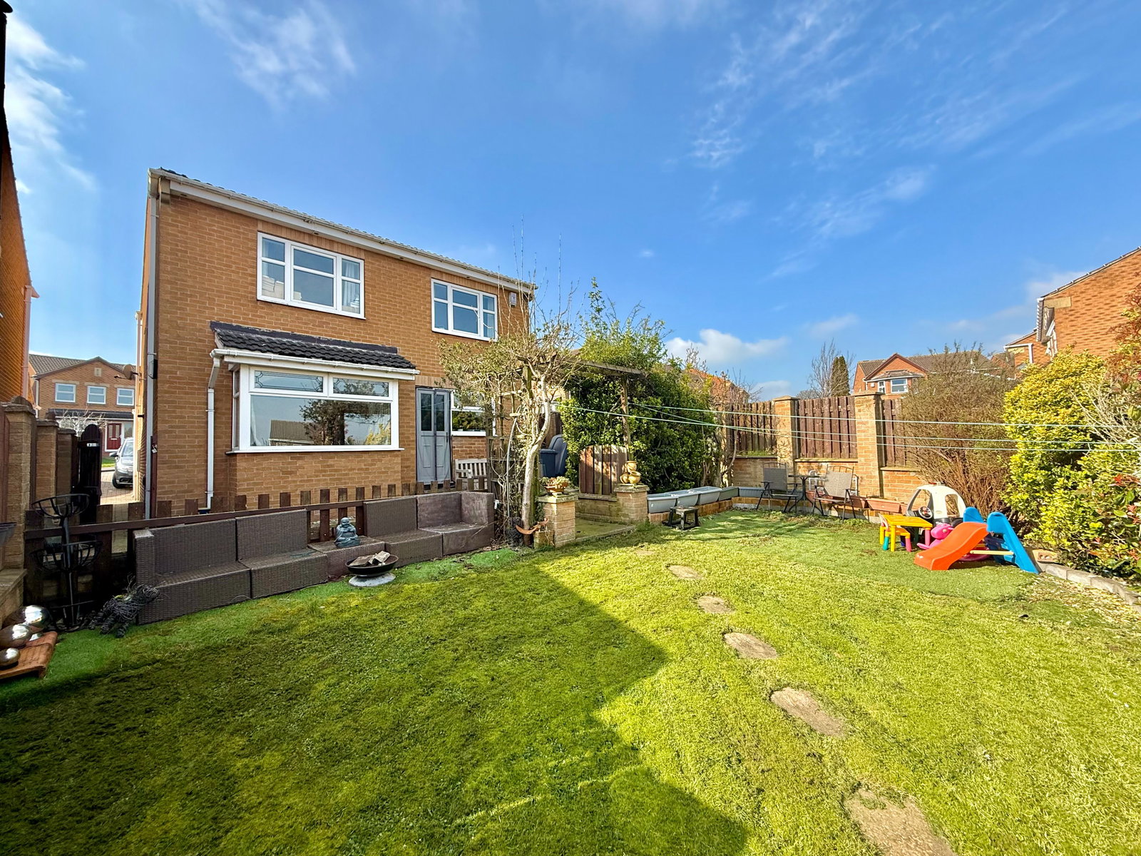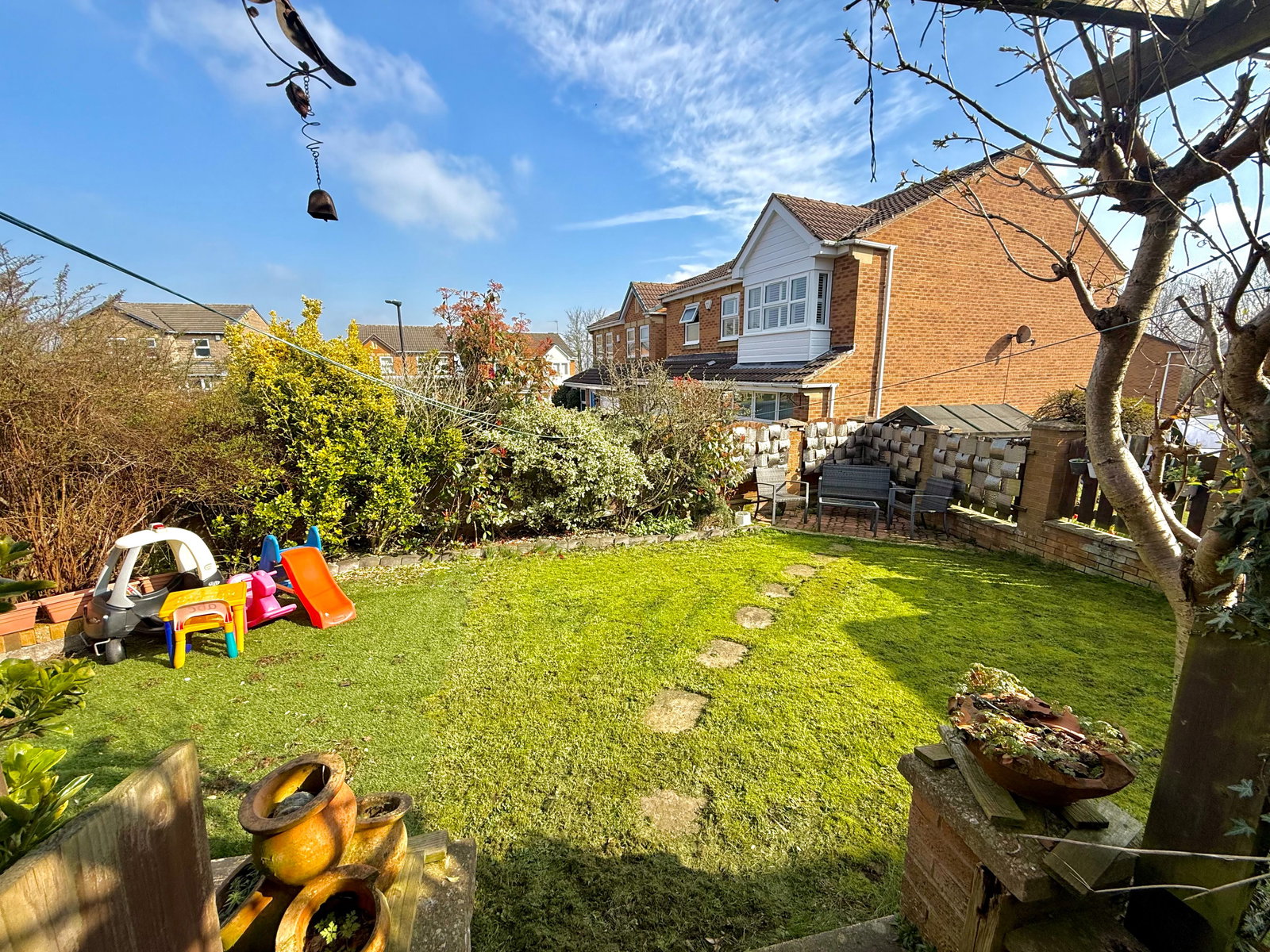 The rear garden features a block-paved terrace immediately adjoining the property, leading to a well-maintained lawn with established, shaped borders and a further patio seating area. The garden is enclosed by a combination of brick walling and fencing, creating a private and secure outdoor space.
