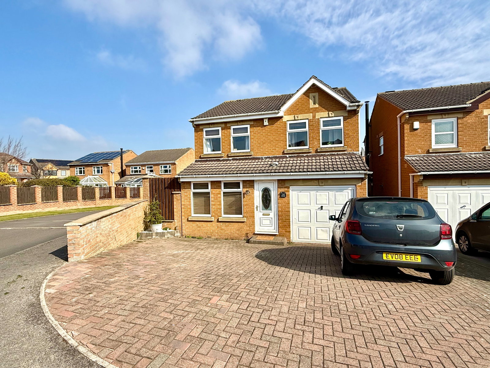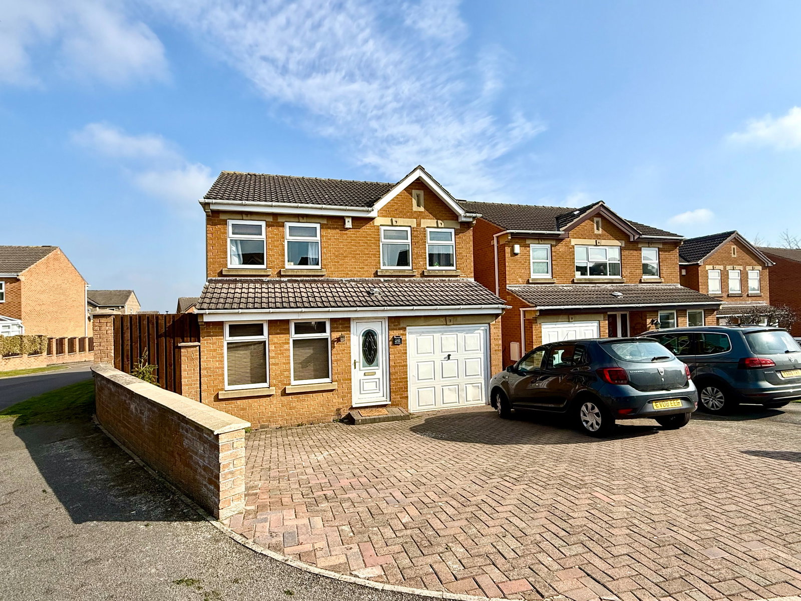 To the front, a generous block-paved driveway provides off-road parking for multiple vehicles and gives access to the integral garage.