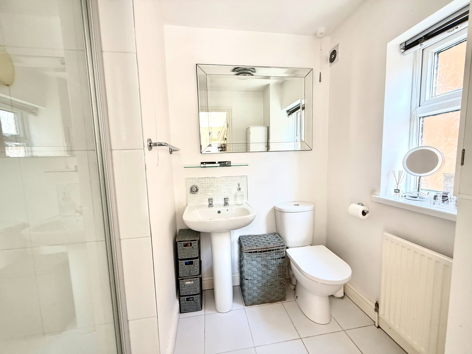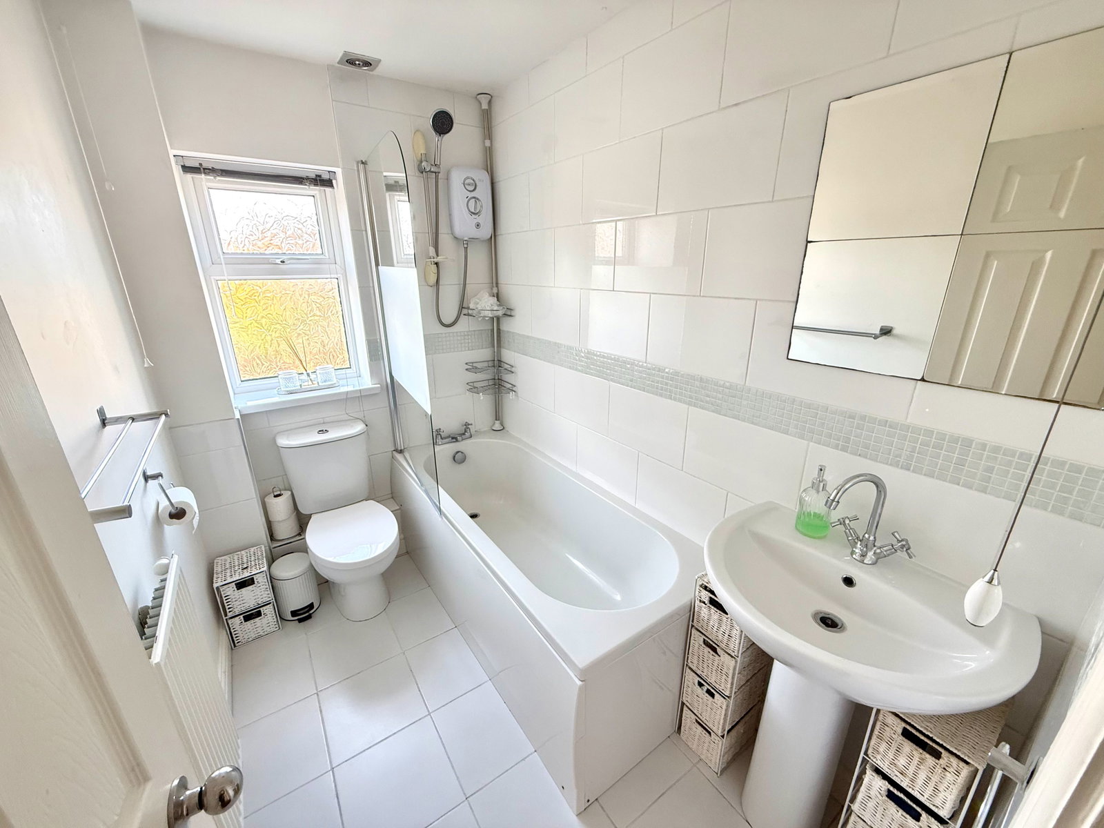 The family bathroom is presented with a modern three-piece suite, comprising a panelled bath with electric shower over, pedestal wash hand basin and low flush W.C. The room is finished with tiled flooring, partial wall tiling and an opaque window.