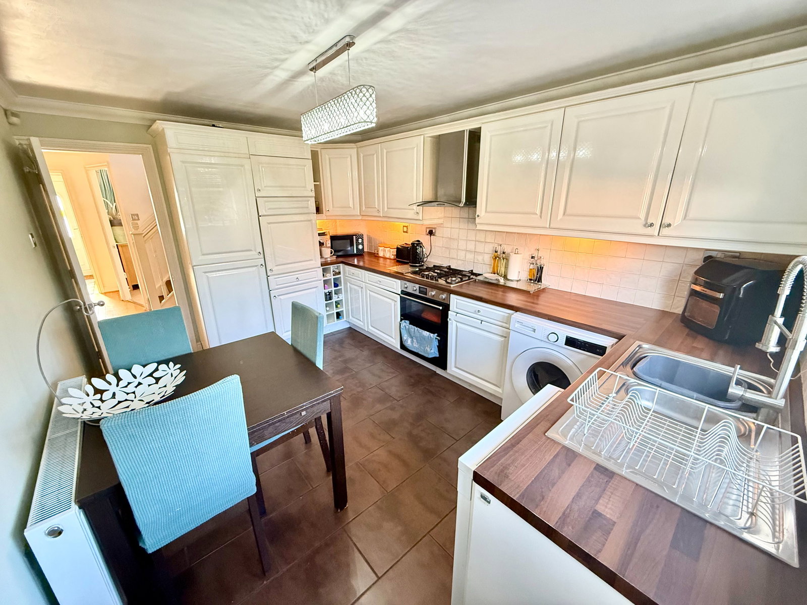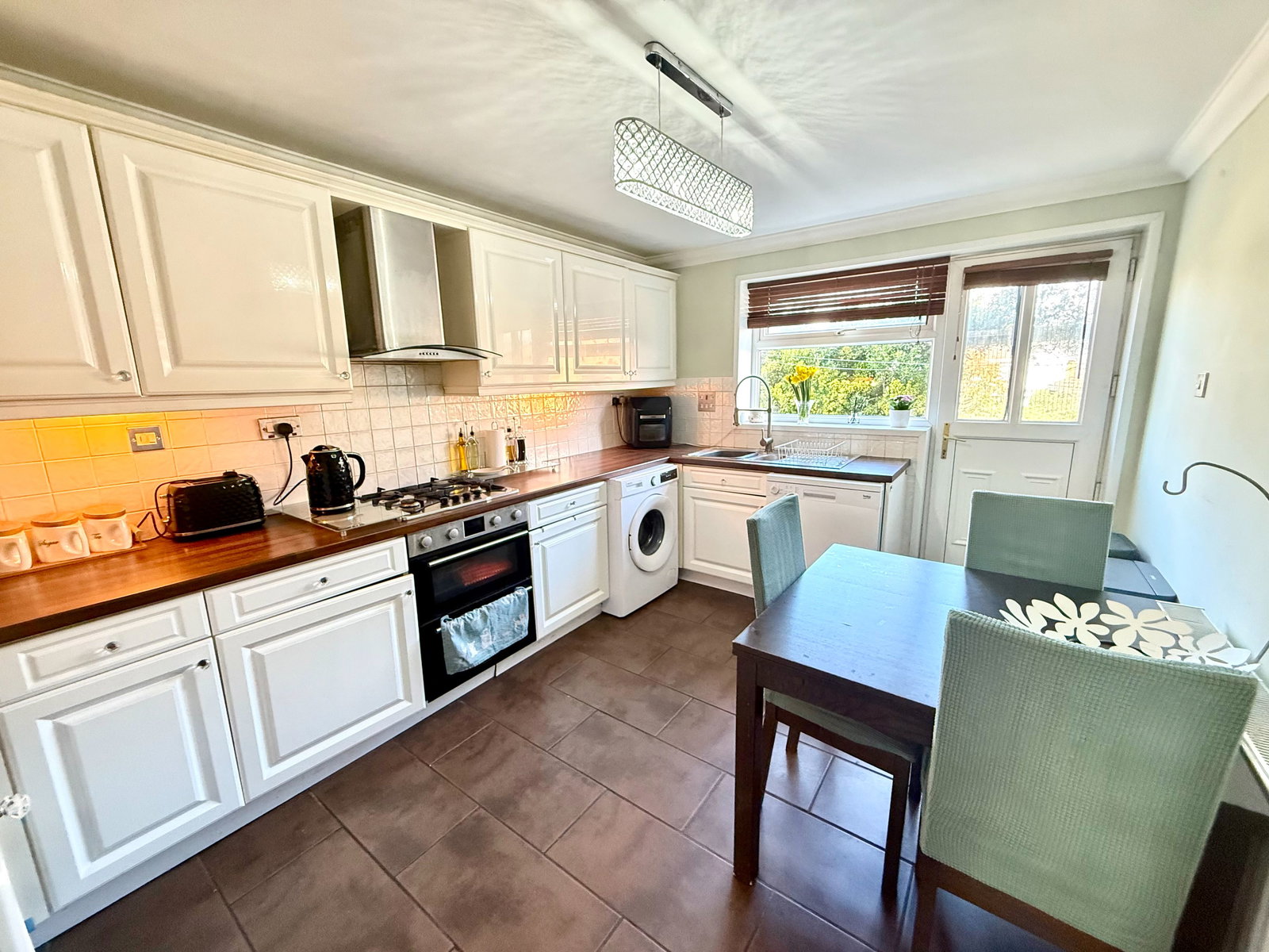 The breakfast kitchen is fitted with units to three walls, complemented by work surfaces incorporating a stainless steel sink unit. There is tiling to the floor and partial tiling to the walls, with a window and double-glazed door providing direct access to the rear garden. Integrated appliances include an oven and grill with a four-ring hob and extractor over, alongside plumbing and space for a washing machine, dishwasher and fridge freezer.