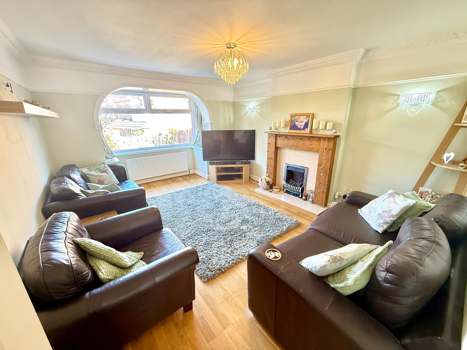 The lounge is a particularly generous reception space, positioned to the rear and enjoying a walk-in bay window overlooking the garden. The room features oak flooring and a focal-point fireplace set within the chimney breast, incorporating a marble-effect inset and hearth with a living flame gas fire.