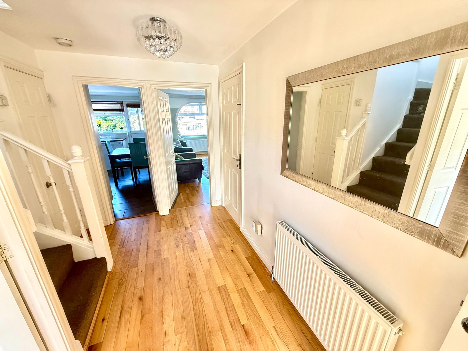 A double-glazed entrance door opens into a welcoming reception porch with oak flooring, which in turn leads through to the central reception hall. The hall features a staircase rising to the first floor, with a useful cloakroom beneath, fitted with a modern two-piece suite and continuing oak flooring. An internal door provides access to the integral garage.