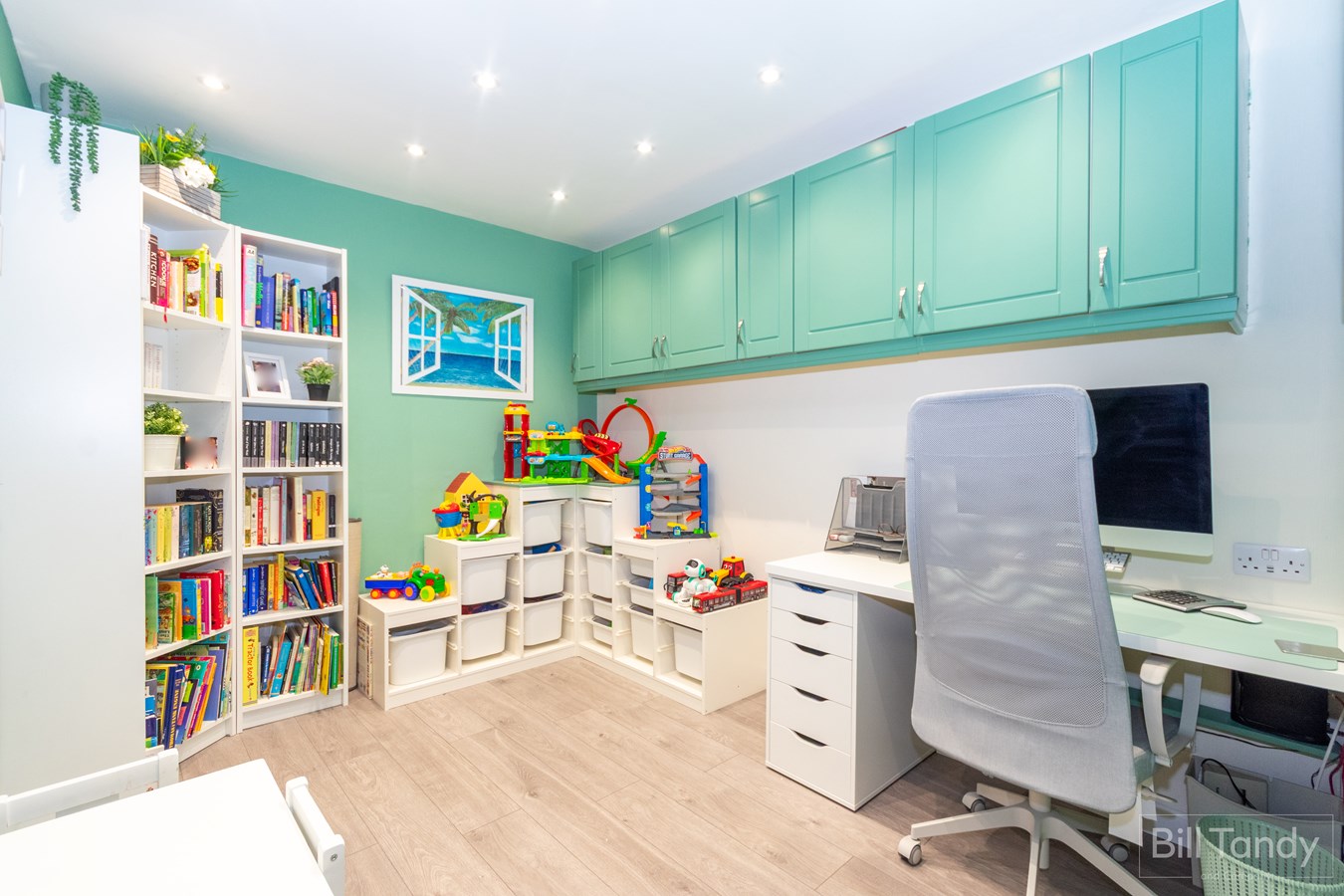 3.40m x 2.70m (11' 2" x 8' 10") currently used as a playroom/office having contemporary wood effect flooring, wall mounted storage units to one wall recessed downlights and the feature glass brick wall allowing light to flood through from the lounge.