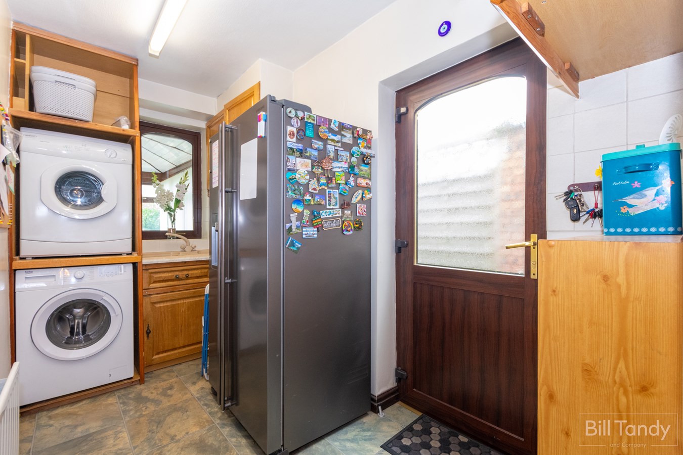 3.20m x 1.90m (10' 6" x 6' 3") having tile effect flooring, traditional wooden base wall mounted cupboards with work surface above, one and a half bowl sink and drainer, matching wall mounted cupboards, space and plumbing for American style stacked washing machine and tumble dryer, space for American style fridge/freezer, UPVC double glazed window looking into the conservatory, UPVC opaque double glazed door to side, ceiling light point and radiator.