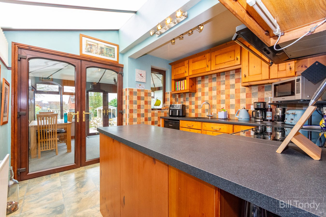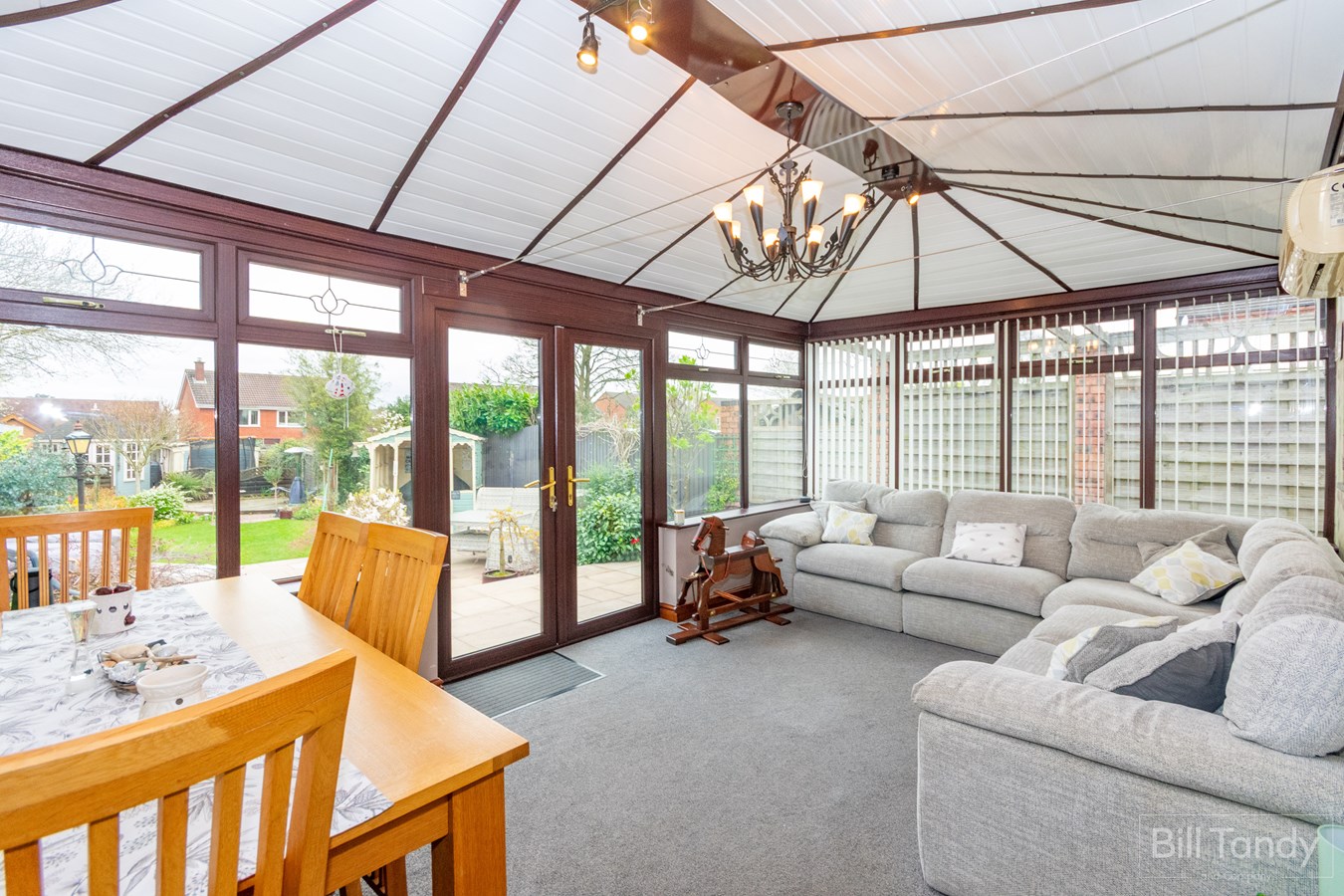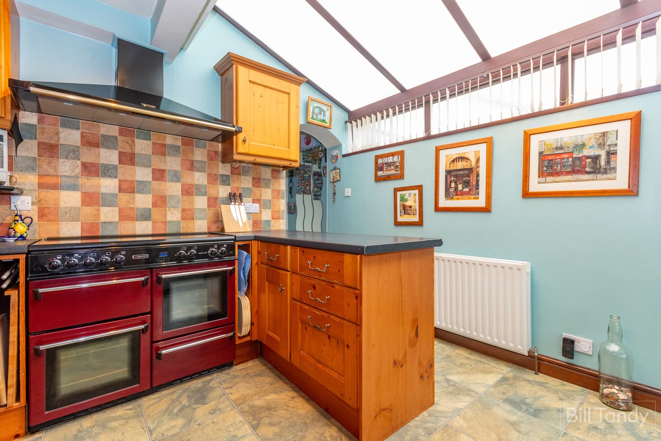 3.40m x 3.20m (11' 2" x 10' 6") having lovely tile effect flooring, traditional wooden base cupboards and drawers with complementary roll top work surface above, matching wall mounted cupboards, space for fridge, gas range style Leisure dual fuel oven with overhead extractor, half solid and half polycarbonate roof, two sets of ceiling lights, UPVC double doors open into the conservatory, UPVC double glazed window to same and radiator.