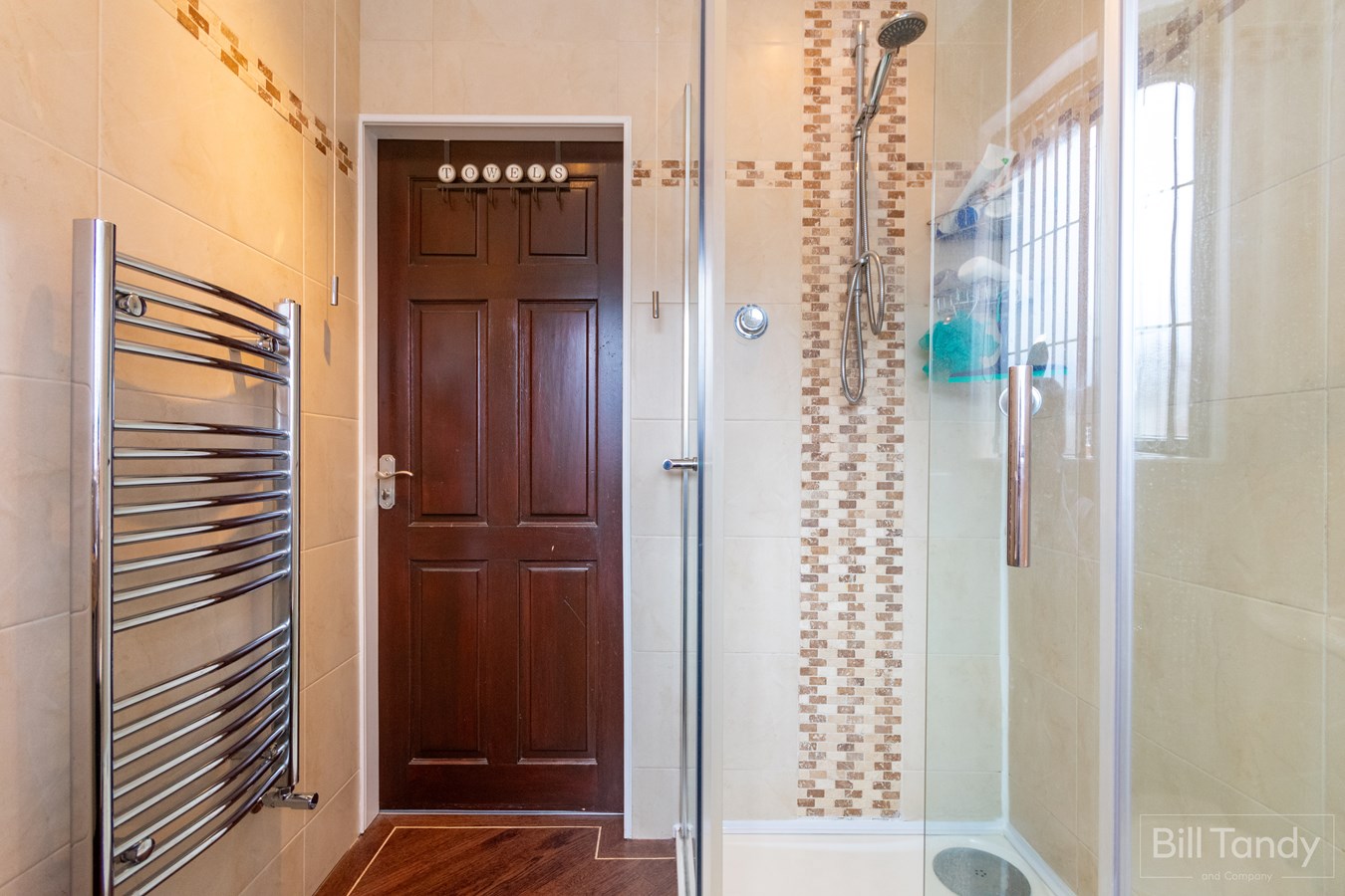 2.00m x 1.70m (6' 7" x 5' 7") having Karndean wood effect flooring, comprehensive ceramic wall tiling, white suite comprising contemporary circular wash hand basin, double shower cubicle with mains fed Mira shower unit and glazed splash screen and low level W.C., ceiling light point, UPVC opaque double glazed window to front and heated towel rail.