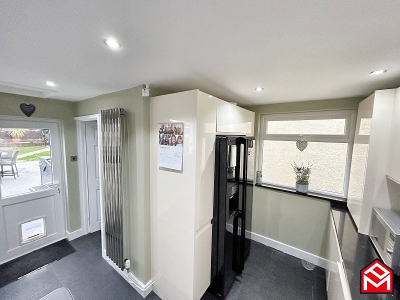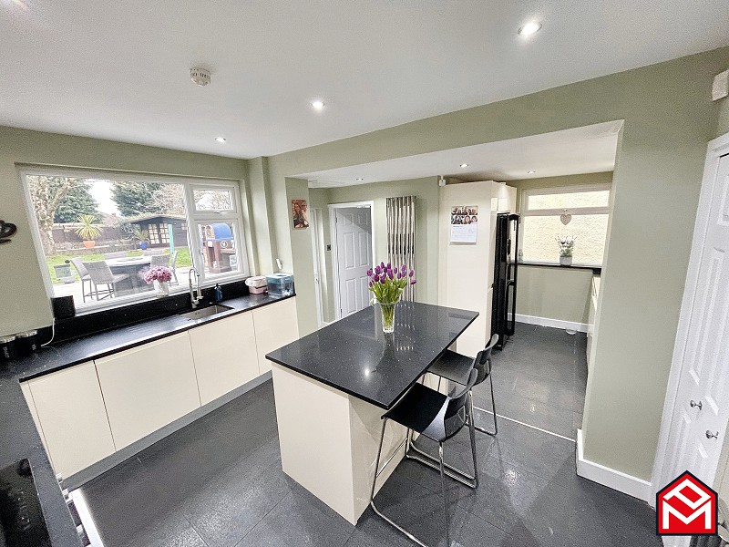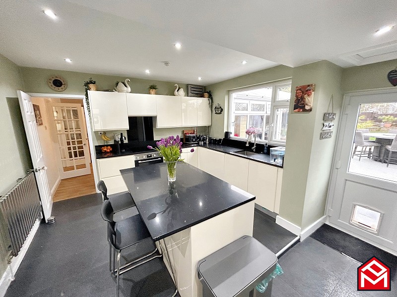 UPVC double-glazed window overlooking the garden, a range of wall and base units with contrasting worktops, integrated Hotpoint induction hob, integrated Kenwood electric oven, extractor fan, integrated Kenwood dishwasher, sink with integrated drainer and central mixer/hose tap, breakfast bar with additional storage, access to pantry, access to integral garage, access to utility area, access to downstairs shower room, access to rear garden via UPVC double-glazed door.