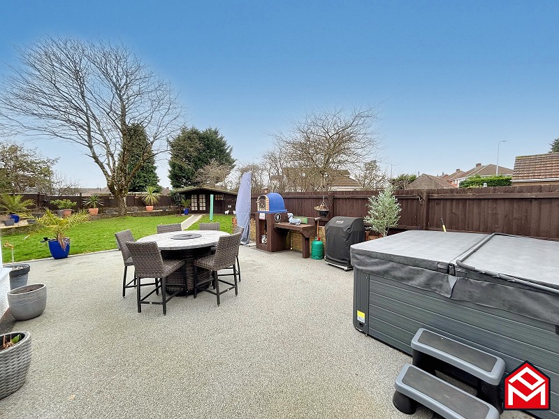 Enclosed rear garden with a resin path leading to the summer house, area of lawn, a range of mature shrubs and plants, raised decked area, hot tub, Italian pizza oven, outdoor tap, outdoor electrical sockets, and access to the front of the property.