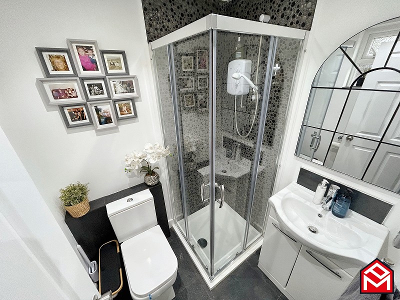 UPVC double-glazed window, WC, wash hand basin with central mixer tap in vanity base unit, shower cubicle with mains shower and glass sliding doors.