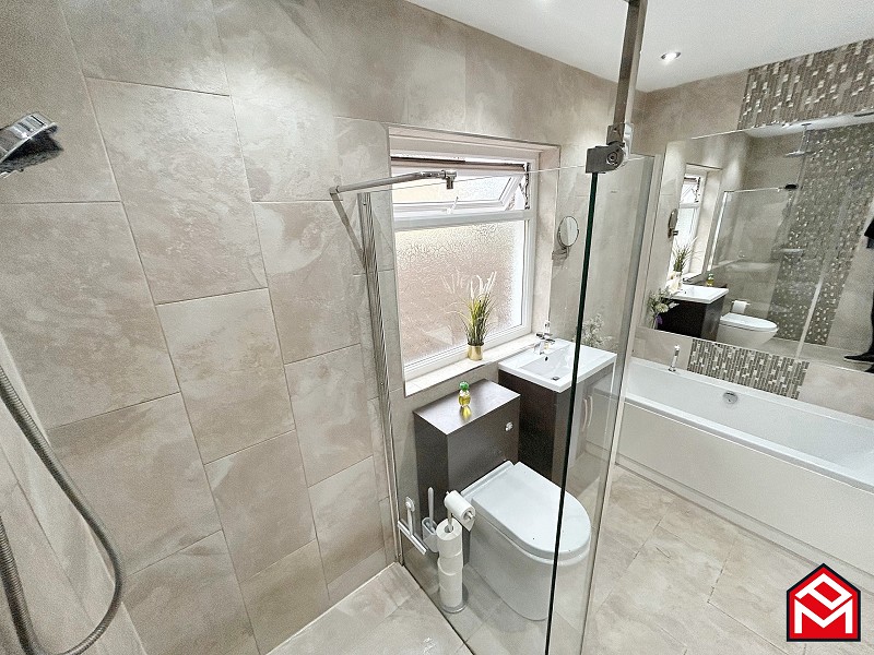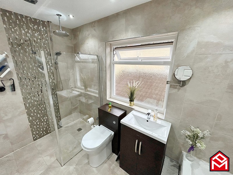 UPVC double-glazed window, rainfall walk-in shower with glass enclosure, WC, wash hand basin with waterfall tap in satin vanity base unit, bath fitted with waterfall tap, warm mirror, floor-to-ceiling tiles, plastered ceiling with spotlights, extractor fan, wall-mounted chrome towel rail.