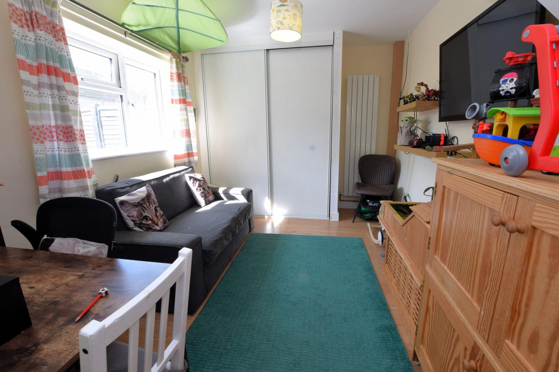 To the rear, the property enjoys a generous garden that’s mostly laid to lawn, with two sheds offering great storage options. Just off the sitting room is a decked area—perfect for outdoor seating or summer barbecues.