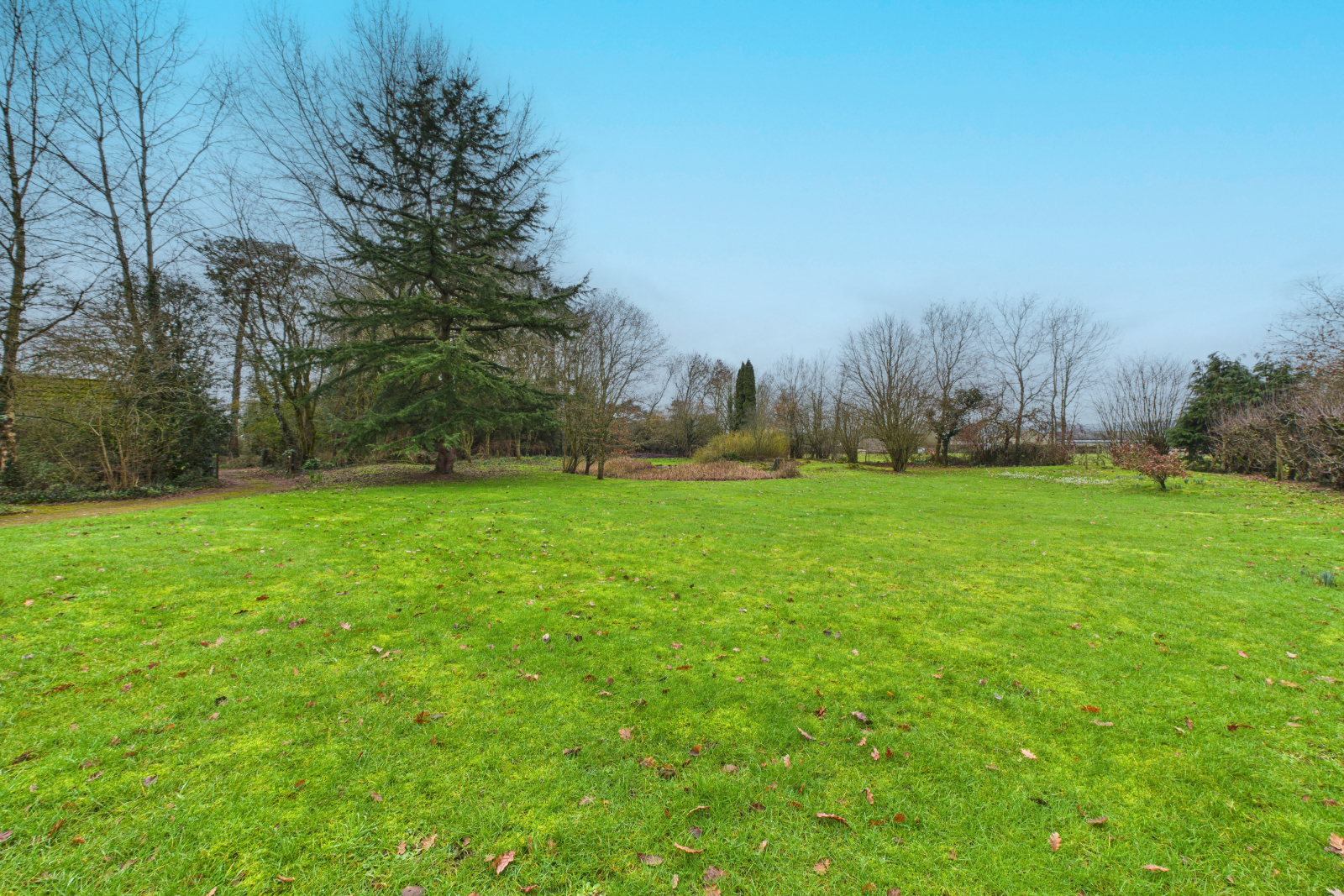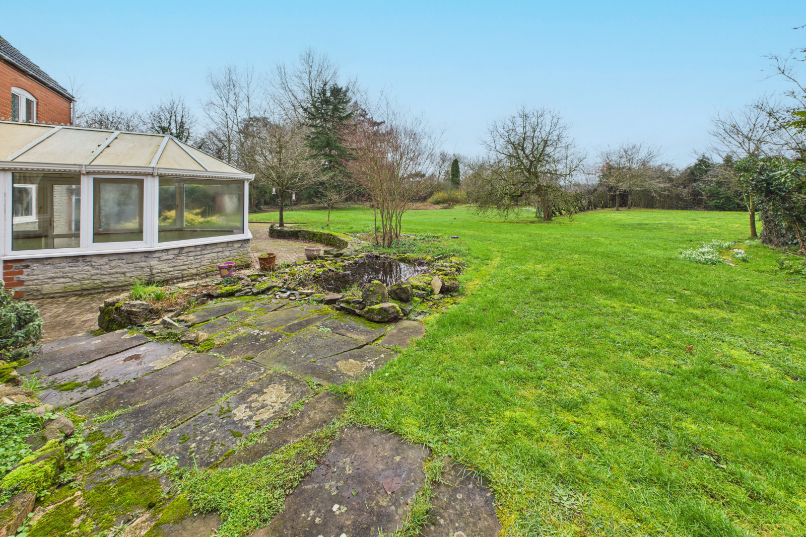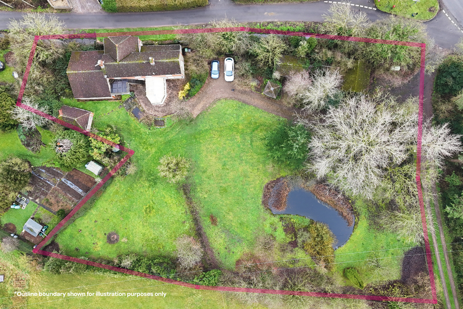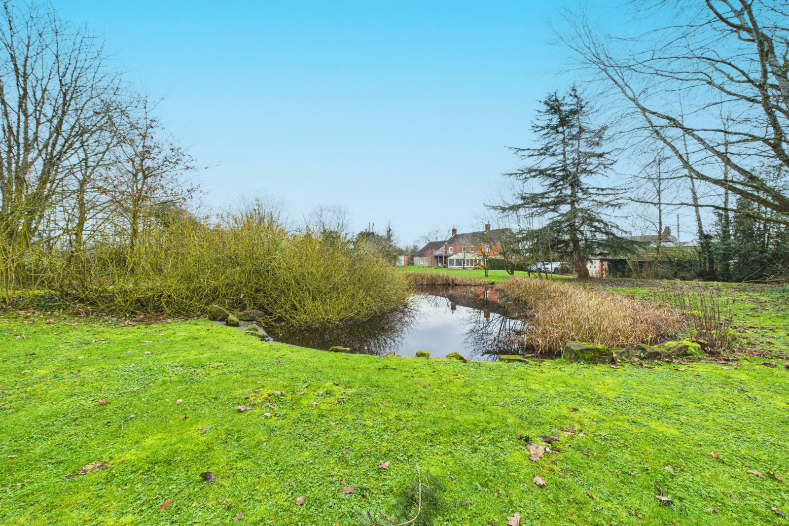 To the outside The gardens extend gracefully around the house, laid predominantly to sweeping lawns and framed by mature trees and natural boundaries that create a wonderful sense of privacy. A picturesque pond forms a peaceful focal point, attracting wildlife and enhancing the feeling of countryside seclusion, while the curved driveway winds gently through the landscape, setting a calm and welcoming arrival. Thoughtfully positioned within the grounds are a range of outbuildings, including garages and a workshop, blending seamlessly into the setting and offering practical space without detracting from the natural beauty. With open lawns, established planting and uninterrupted views across neighbouring fields, the grounds provide an idyllic environment for outdoor living, quiet reflection and year round enjoyment.