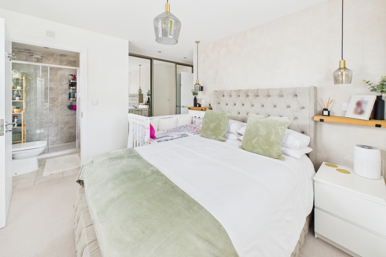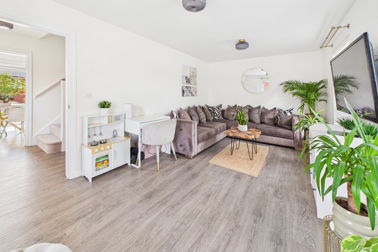 Kitchen / DinerThis stunning open-plan kitchen/dining space is ideal for family life and entertaining. With two UPVC double-glazed windows and patio doors opening onto the garden, the room is flooded with natural light. The sleek modern kitchen features a comprehensive range of gloss cabinets with black work surfaces and matching upstands, a 1.5 bowl stainless steel sink with mixer tap, integrated fridge and freezer, eye-level double ovens, and a dishwasher. A four-ring gas hob is complemented by a glass splashback and stylish black extractor fan. Enhanced by spotlights, under-cabinet lighting, and upgraded downlighting over the breakfast bar, this room is both practical and beautifully designed. Wood-effect flooring continues throughout, with ample power points, a radiator, and space for a dining table.