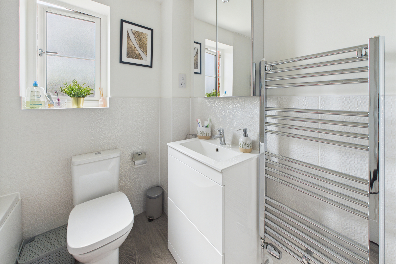 Downstairs CloakroomA well-appointed cloakroom with a contemporary white suite comprising a low-level push-button WC and a vanity unit with mixer tap and tiled splashback. Finished with wood-effect flooring, central ceiling light, radiator, and extractor fan.
