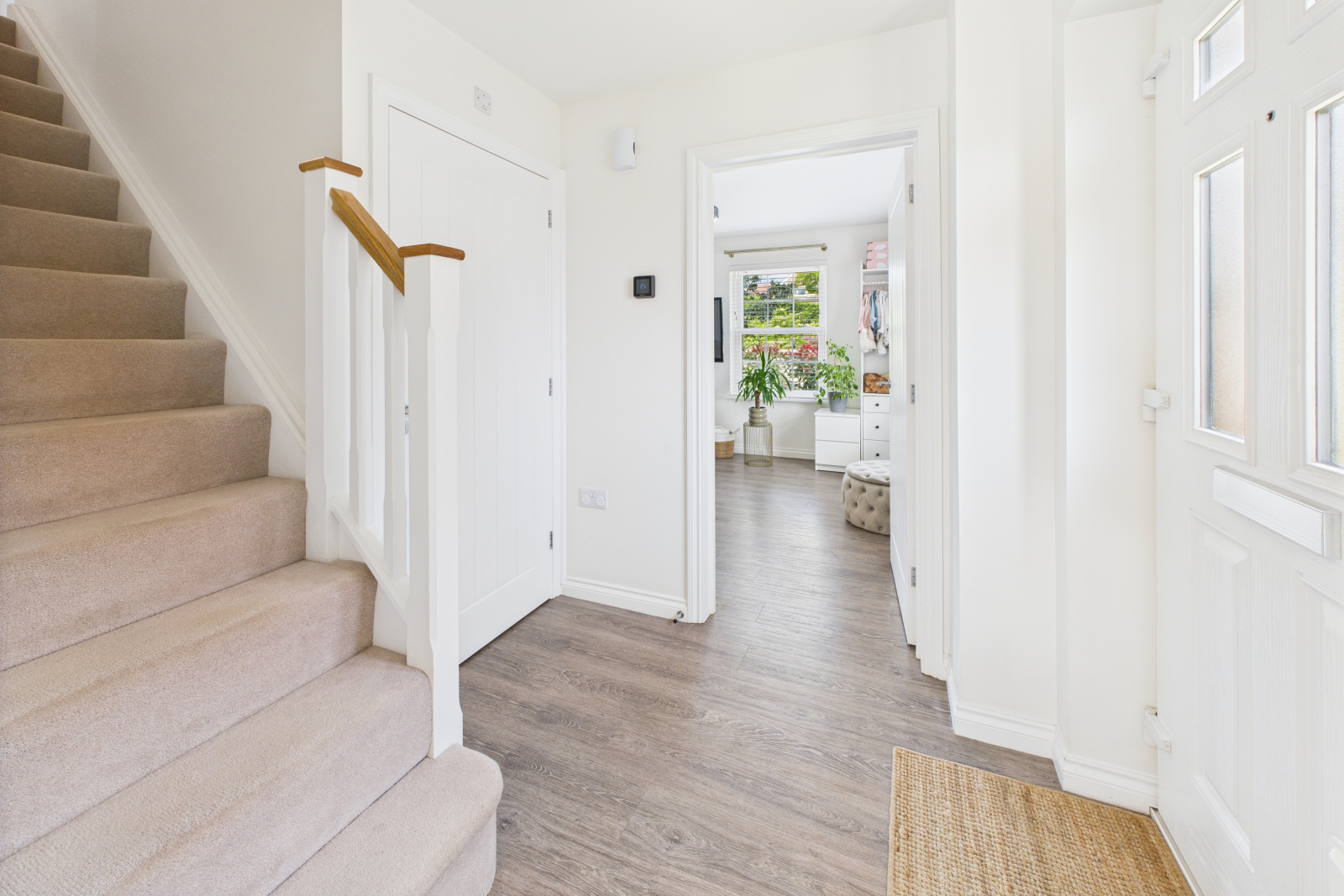 Utility RoomA practical and stylish space, perfect for busy households. Accessed via a composite door with obscured glazing leading to the garden, the utility room offers a selection of base and wall units with a matching modern worktop and upstands, stainless steel sink and drainer with mixer tap, and space for under-counter appliances with plumbing for a washing machine. Includes wood-effect flooring, central lighting, radiator, power points, and a large under-stairs storage cupboard with lighting.