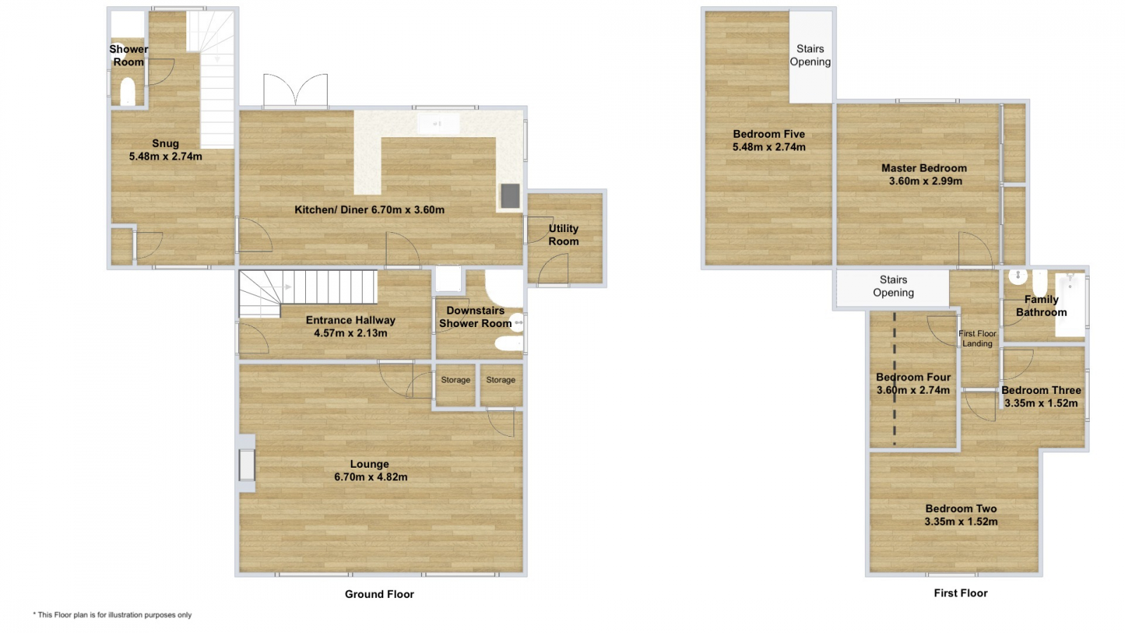 Two large UPVC double-glazed windows to the front elevation with obscured glazed panels. This beautifully presented large room has a charming feature wood burner with an oak beam above and a tiled hearth. Wood effect flooring throughout and two central ceiling lights. Power points and TV point. Radiator and doors to two large storage cupboards with hanging rails and shelving.