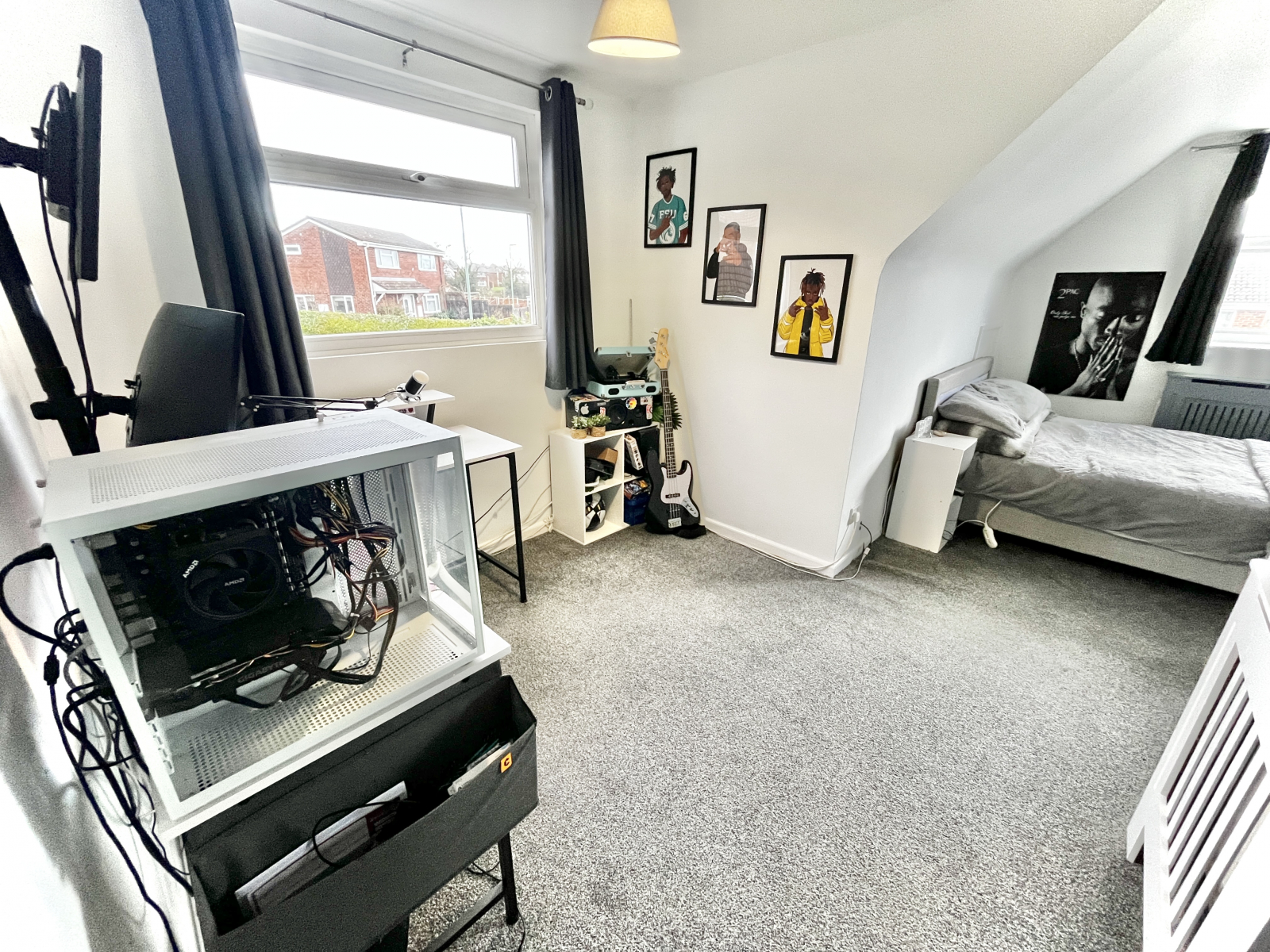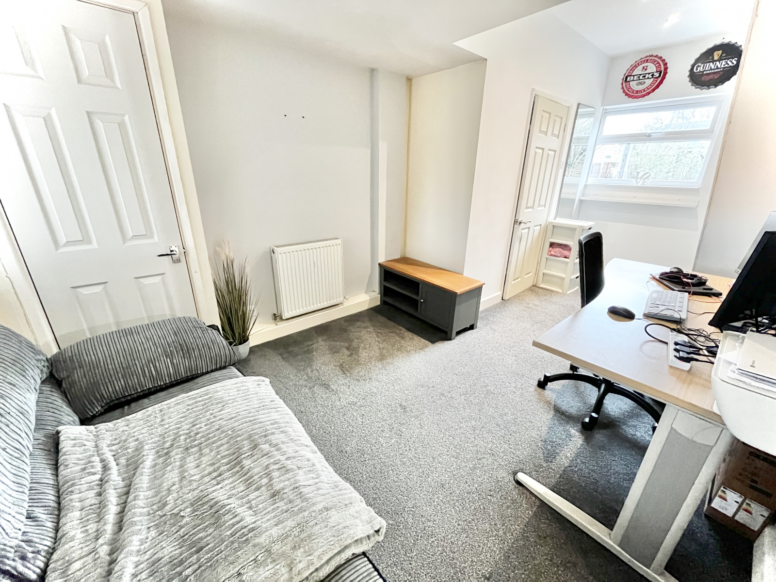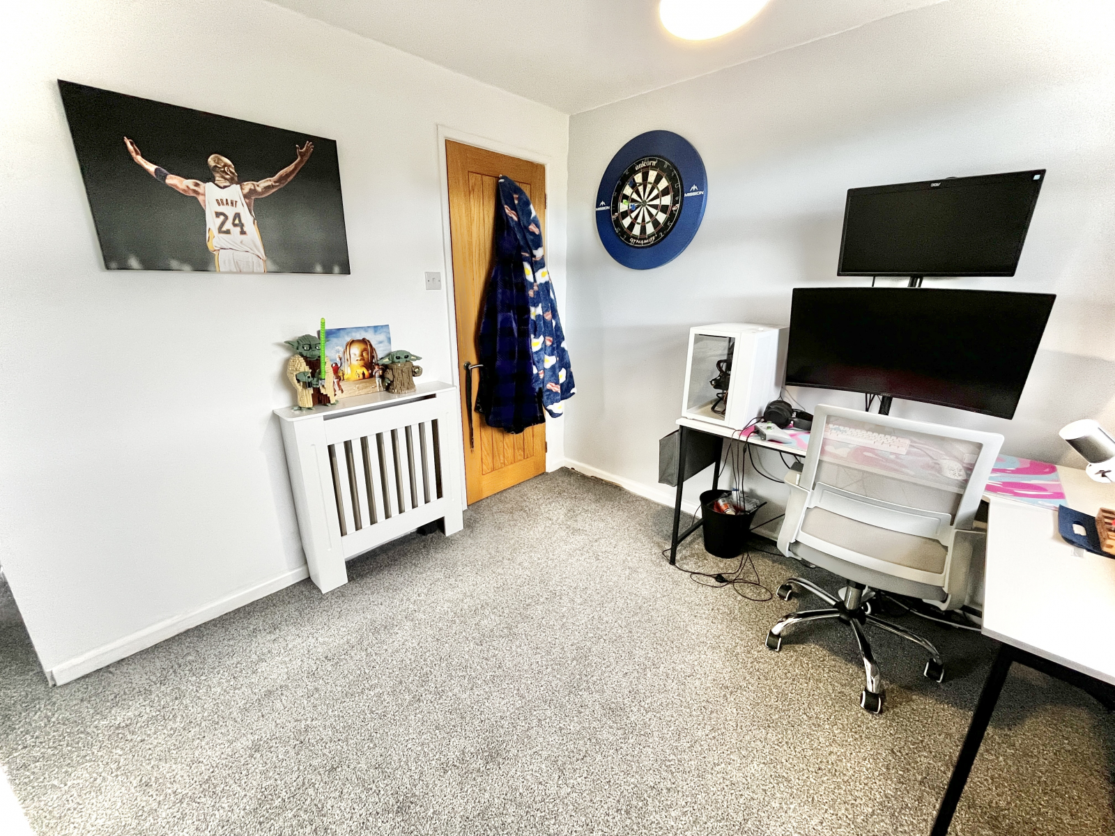 UPVC double-glazed window to side elevation. Carpeted flooring and radiator. Central lighting and range of power points.