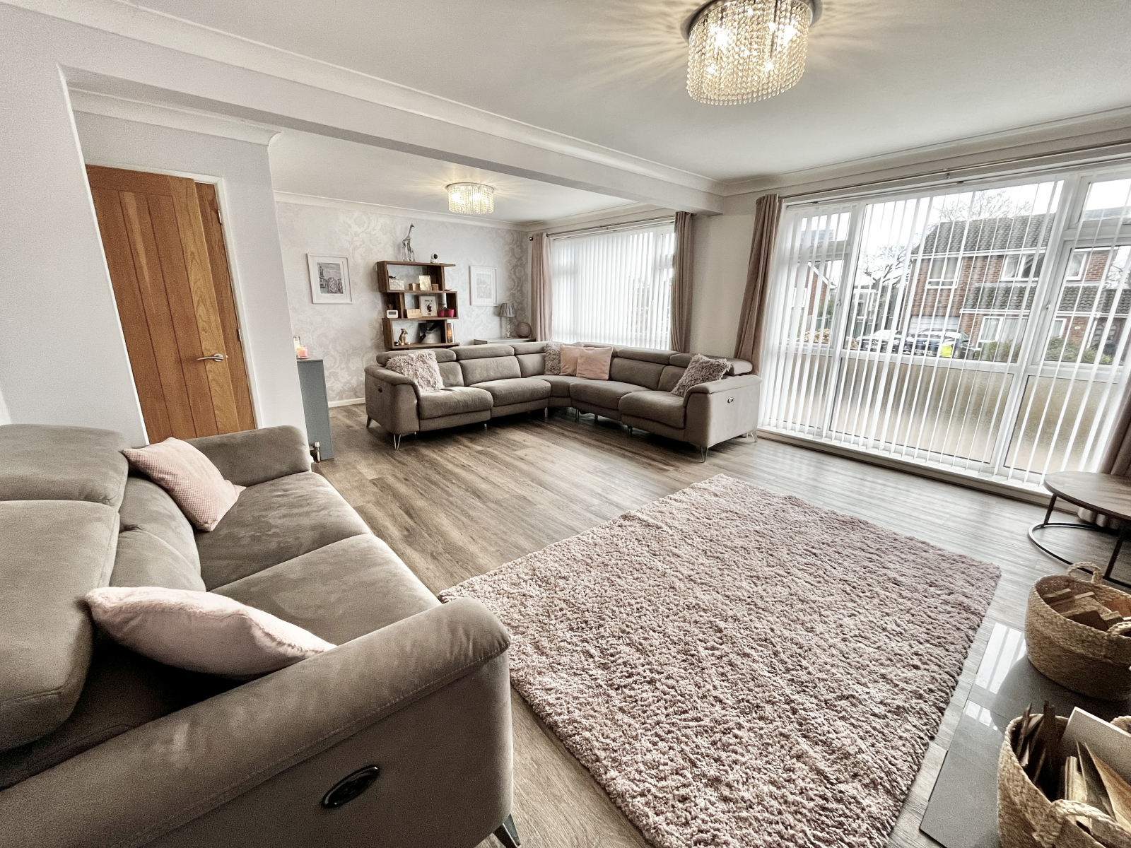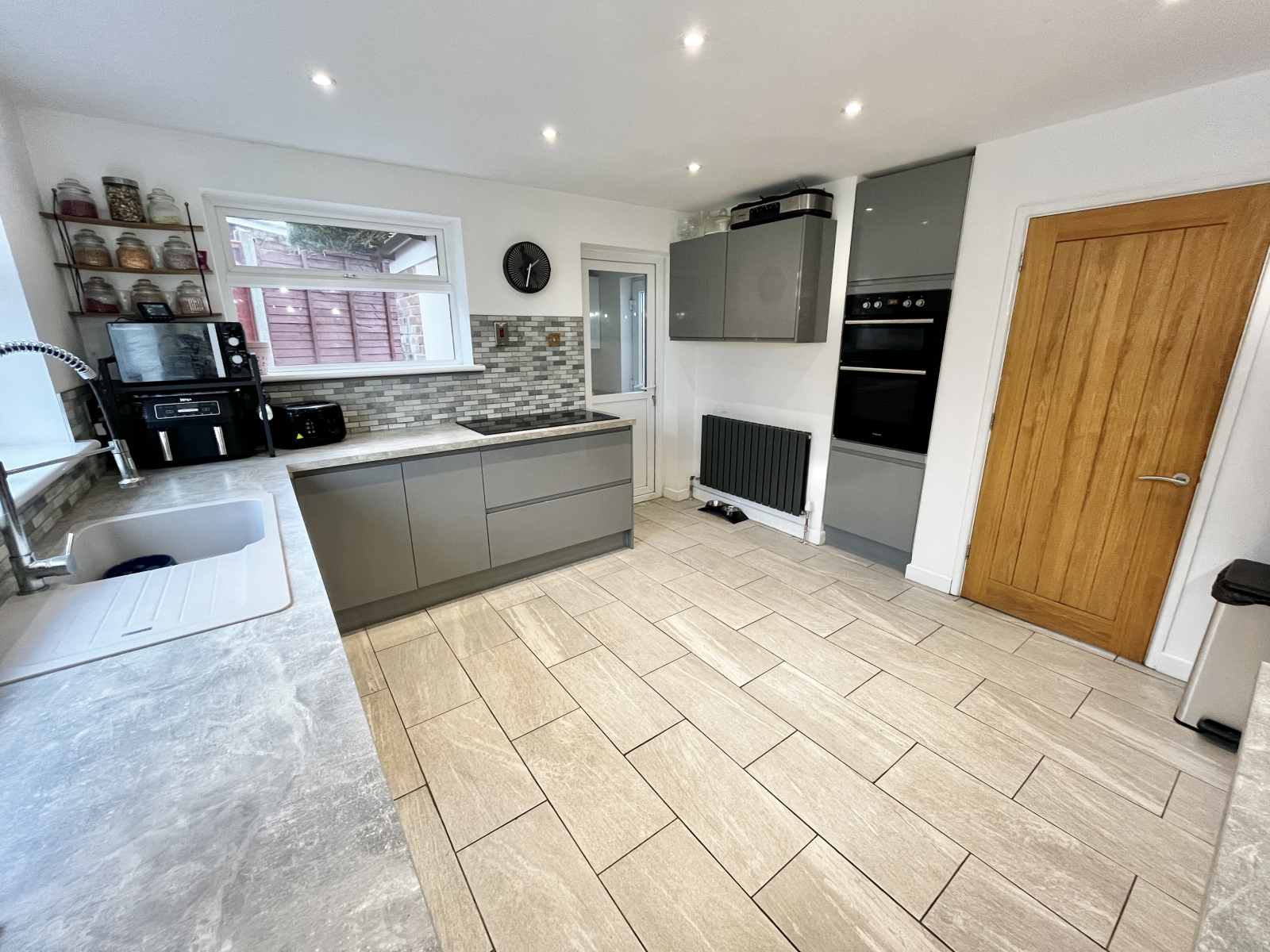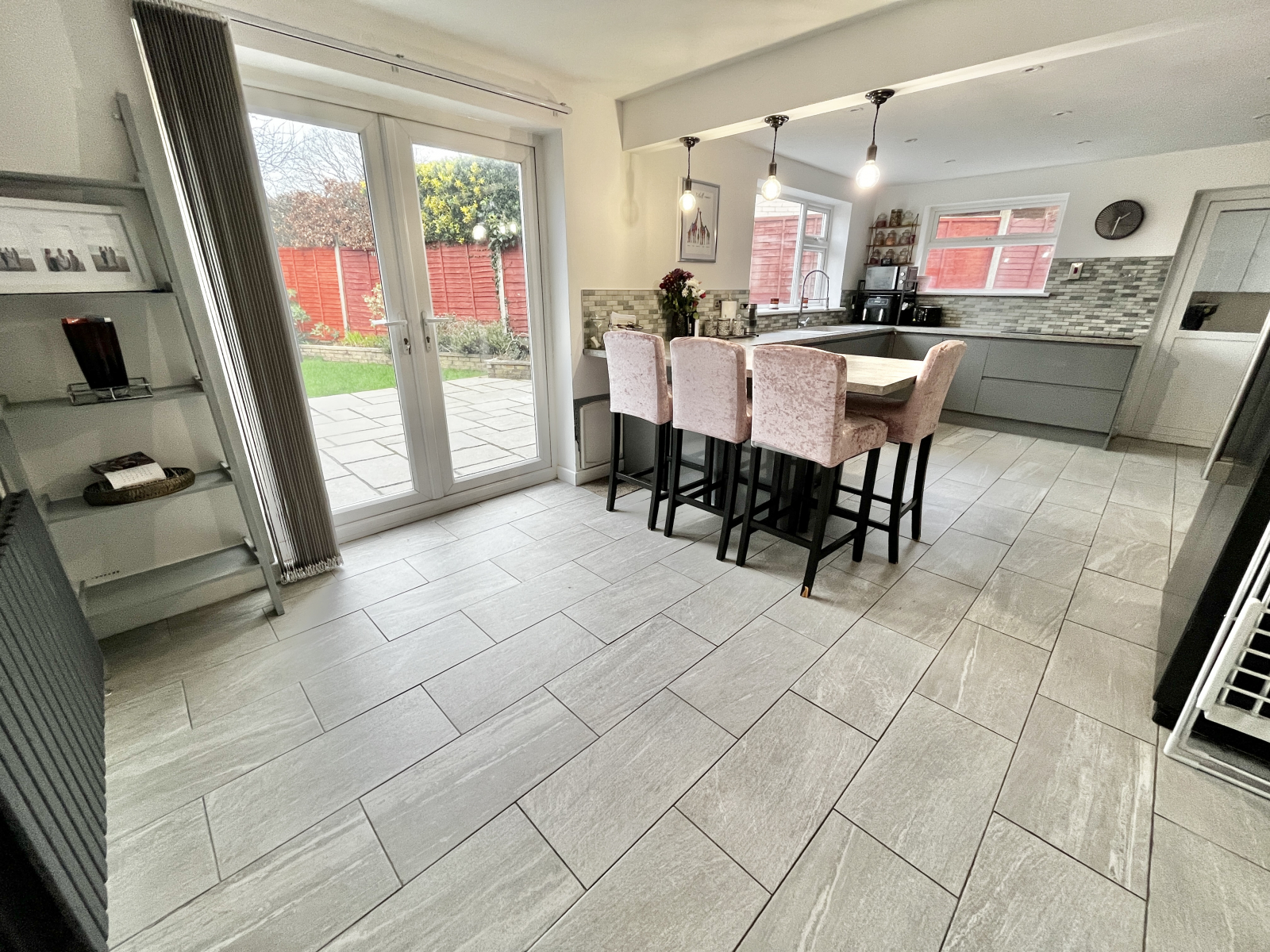 Two large UPVC double-glazed windows to rear and side elevations. UPVC double-glazed patio doors giving access to the garden. Immaculately presented and extended having a fantastic range of fitted base and eye level units and drawers with laminate work surfaces and tiled splash backs. Acrylic sink and drainer with pull-out shower mixer tap. Breakfast bar area which is great for entertaining. Integrated Hotpoint double oven and ceramic five-ring job. Integrated dishwasher. Tiled flooring throughout with spot lighting and feature down lighting. Modern radiator and power points. Doors leading off.