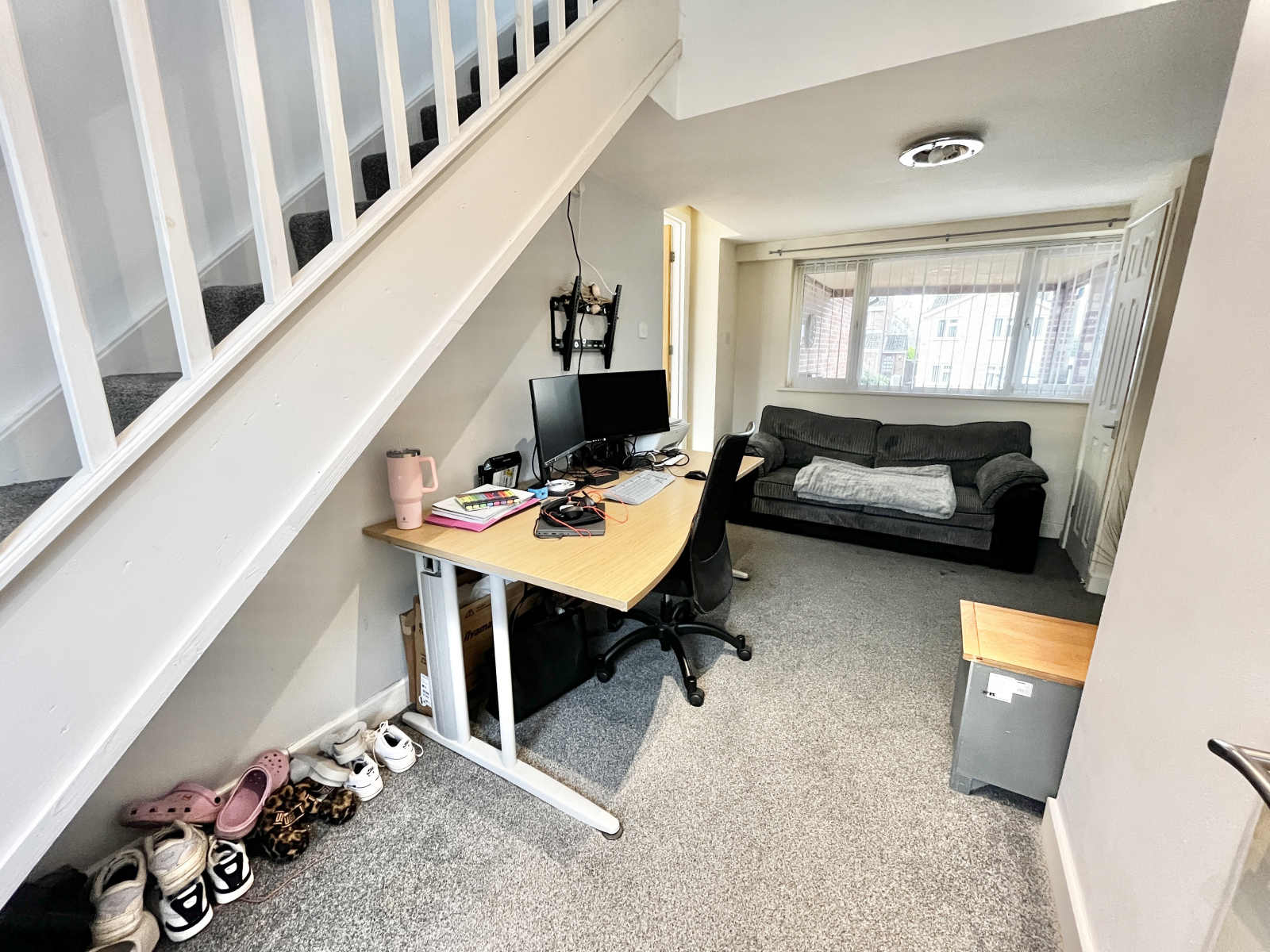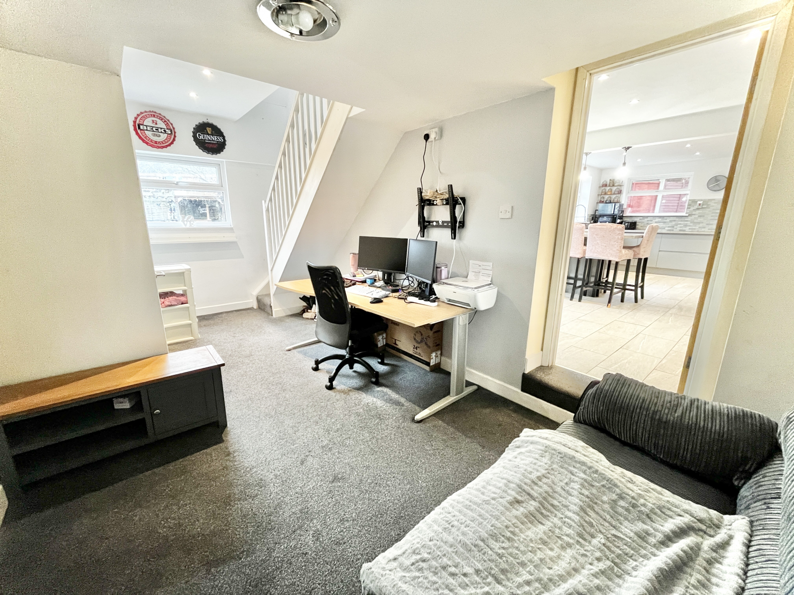 Dual aspect UPVC double-glazed windows to front and rear. Carpeted with cupboard housing central heating boiler. Open carpeted stairwell to first floor bedroom. Power points and Door to