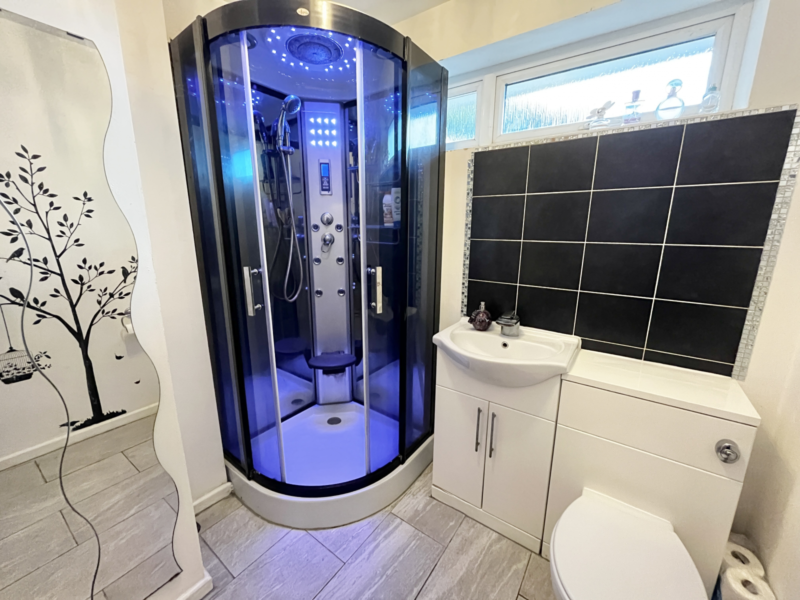 Two UPVC double-glazed obscured windows to side elevation. Low-level push button W.C. with integrated bathroom cabinets, having a ceramic sink with mixer tap and vanity unit below. Insignia fitted corner shower with feature jets, seating, radio, and shower attachments. Tiled splash backs and stainless steel heated towel rail. Tiled flooring, and central lighting.