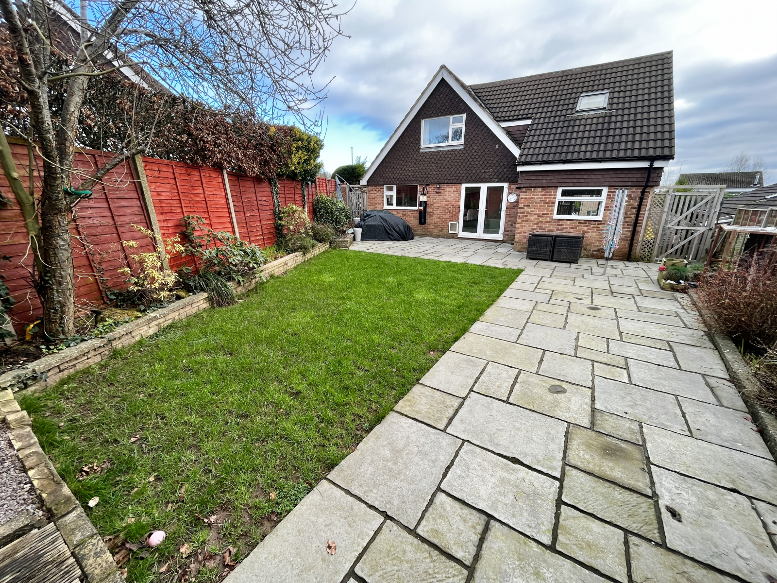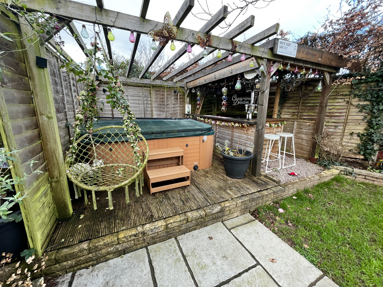 To the rear, the beautifully landscaped large garden has secure fenced boundaries and a spacious modern patio area, ideal for enjoying outdoor living. Raised flowering borders and outdoor power and lighting. The garden also benefits from a delightful raised decking area having a wooden pergola and hot tub. To the side is an outdoor bar area. The rest of the garden is laid to lawn with gated side access.