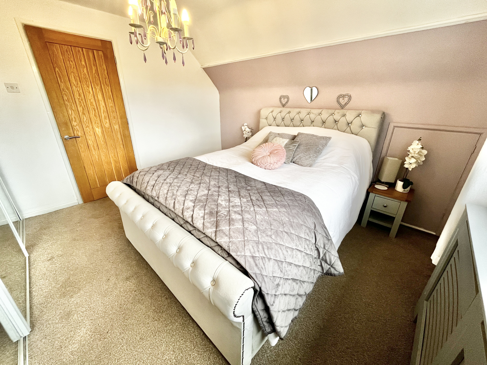 Large UPVC double-glazed window to rear with pleasant outlook over the garden and elevated views towards woodland. Carpeted with central lighting. Mirrored wardrobes with sliding doors giving exceptional storage space and having hanging rails and shelving. Further eves storage.