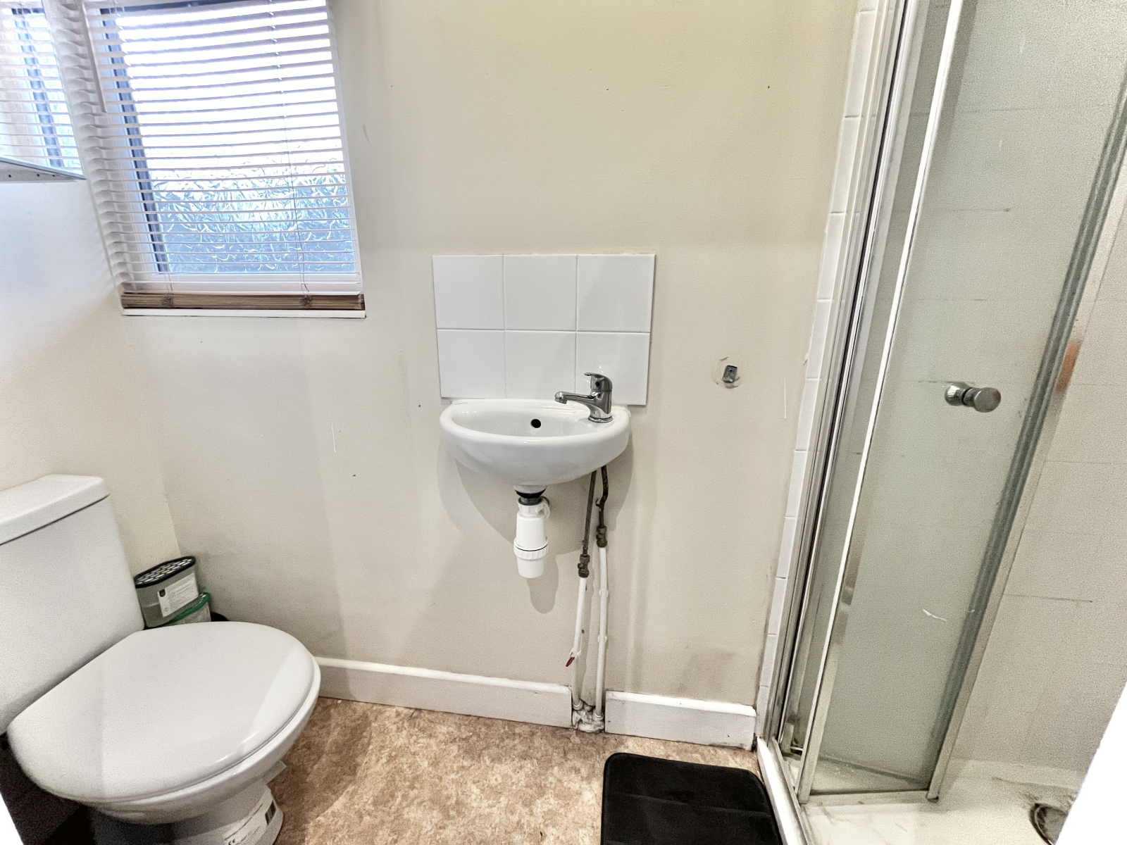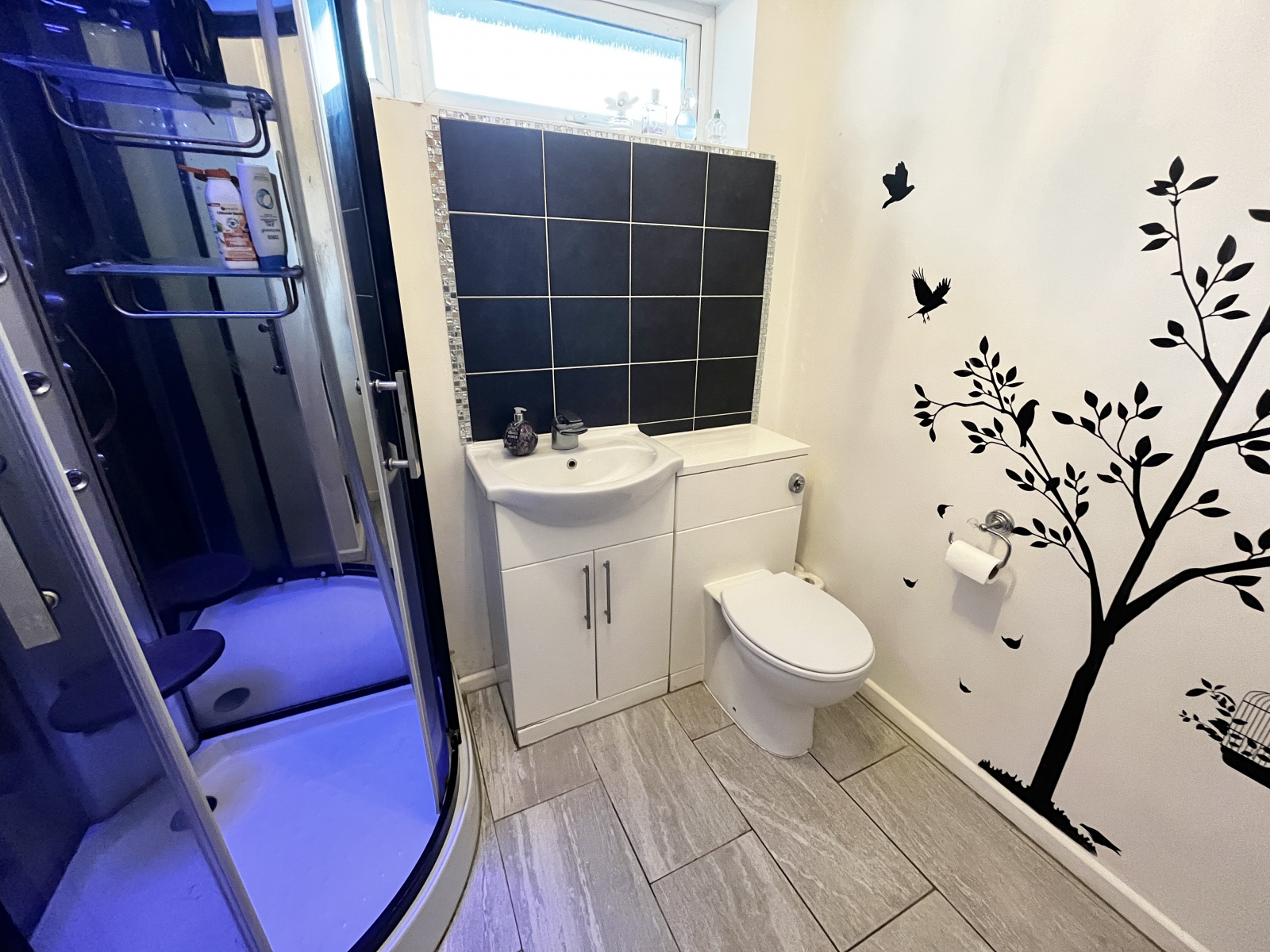 Obscured UPVC double-glazed window to side. Step in glazed shower with attachments. Wash hand basin with mixer tap and tiled splash backs. Low-level push button W.C. and vinyl flooring. Central light and extractor fan.