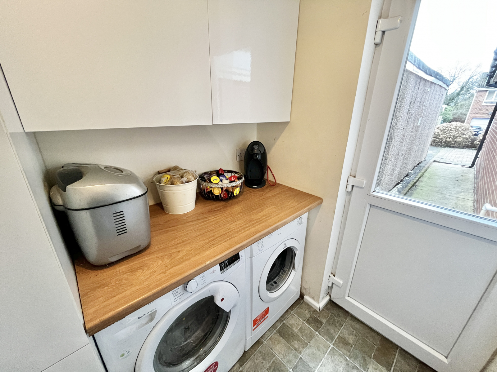 Fitted range of cabinets with wood effect work surface and space for washing machine and tumble dryer. Tile effect flooring and UPVC half-glazed door to side.