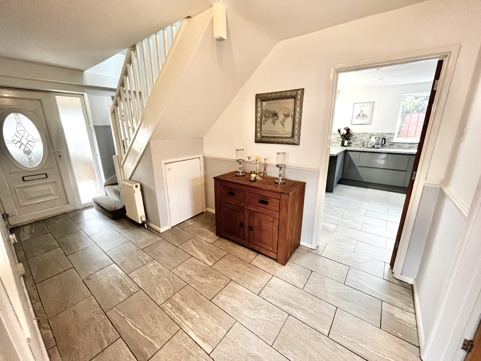 UPVC double-glazed door with inset glazing and obscured inset window. Further obscured window to side Reception Hallway Bright and spacious with tiled flooring throughout. Central lighting and radiator. Open carpeted stairwell to the first floor. BT point and power points. Under stairs storage cupboard and wall-mounted central heating controls. Doors leading off.