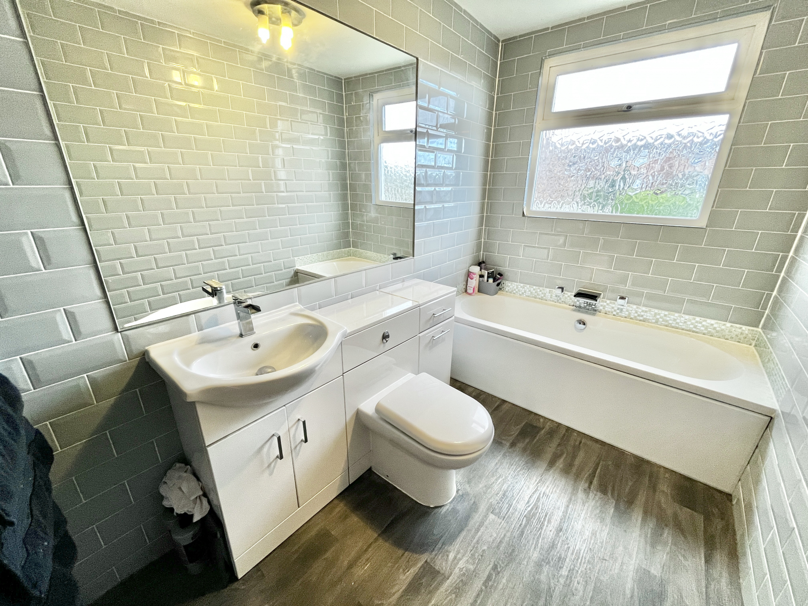 UPVC double-glazed window to side elevation. Modern suite comprising of panel bath with rainfall mixer taps. Large fitted vanity unit including ceramic sink with mixer tap. Low-level push button W.C and abundance of storage. Fully tiled with metro tiling and having a large mirror. Vinyl wood effect flooring and central lighting. Stainless steel heated towel rail.