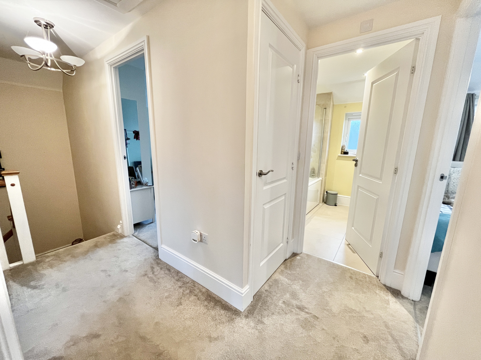 Wooden white banisters, carpeted flooring, and power point. Loft access and doors leading off. Door to airing cupboard with hot water system and storage. Chrome effect light fitting.
