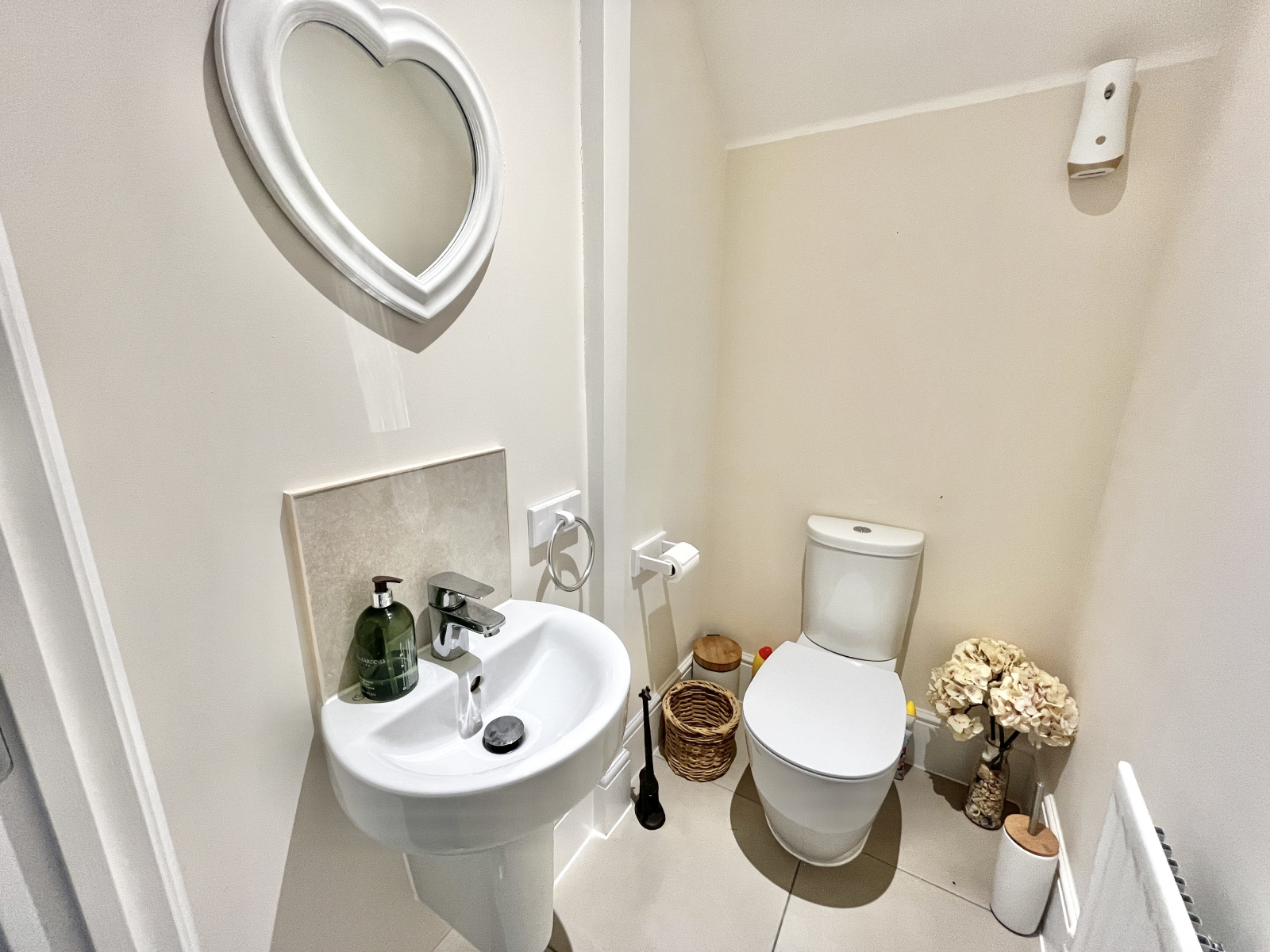 UPVC obscured double-glazed window to rear aspect. White suite comprising of; low-level push button W.C and wash hand basin with mixer tap and fitted mirror over. Panel bath with chrome effect mixer taps and glazed shower screen. Fitted power shower over bath with attachments and fully tiled. Spotlighting and cream ceramic tiled flooring. Shaving point and chrome effect heated towel rail. Extractor fan and floating shelf.