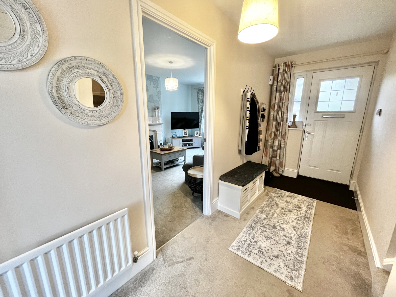 Obscured panel glazed entrance door with inset UPVC double-glazed window. Fitted door matt and carpeted flooring throughout. Open stairwell to the first floor. Bespoke and upgraded glazed doors, modern chrome effect light fitting, and radiator.