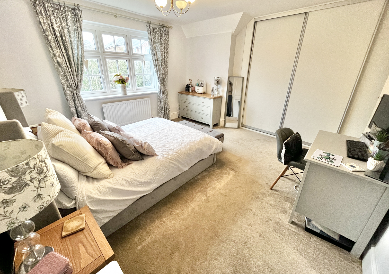 UPVC double-glazed window to front aspect with pleasant outlook. Fitted carpet and large white fitted wardrobes having sliding doors, hanging rails, and shelving. Double radiator and power points. Door to: