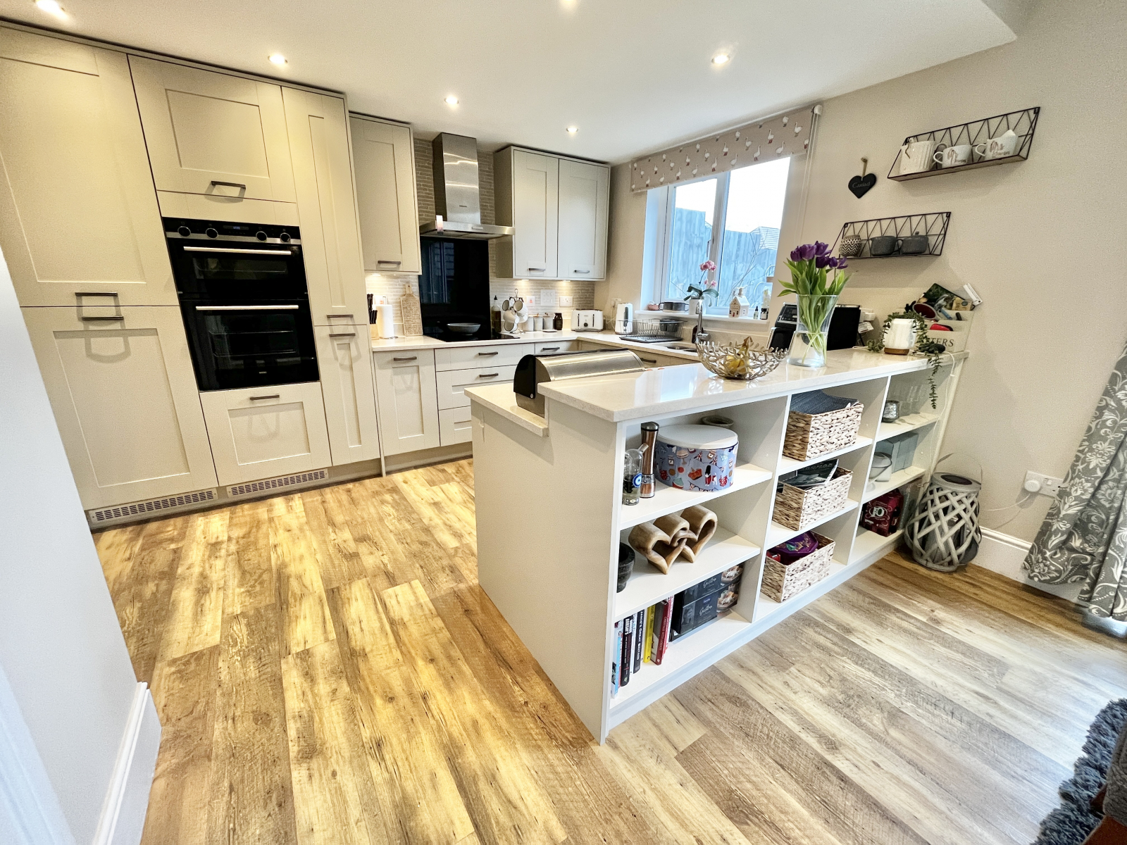 The alluring and upgraded kitchen is truly exceptional. Having an excellent range of shaker-style base and eye level fitted units and drawers with granite worktops and matching upstands. Sunken 1 1/2 bowl stainless steel sink and drainer with chrome effect mixer taps. Integral Siemens electric double oven and grill. Siemens four ring induction hob with black glass splashback and chrome effect extractor hood. Soft closing doors and drawers with built-in fridge/ freezer. Integral dishwasher, tiled splashbacks, and feature spotlighting. Karndean wood effect flooring throughout and power points. UPVC double-glazed window to rear elevation. Door to: