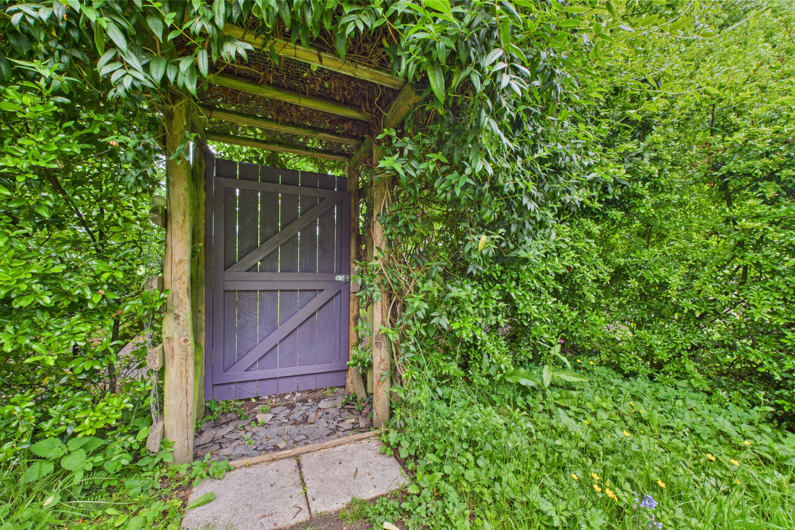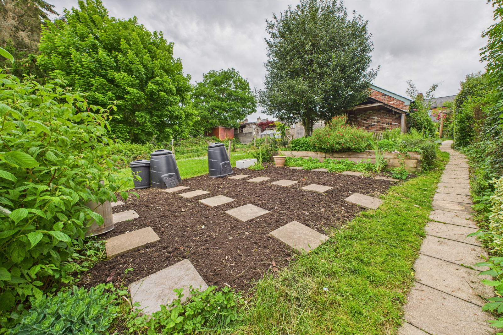 • Raised terrace, greenhouse, and large vegetable plot