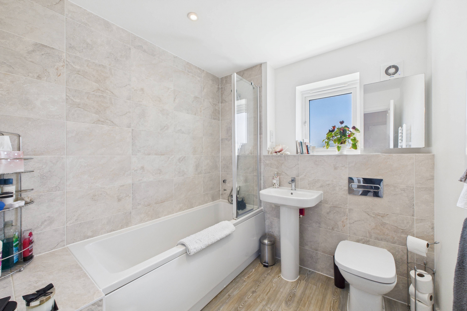 A beautifully designed family bathroom with a clean, modern suite including a full-size bath, chrome shower fittings, and a glazed screen. Finished to a high standard with wood-effect flooring, a heated towel rail, mirrored vanity unit, and stylish lighting.