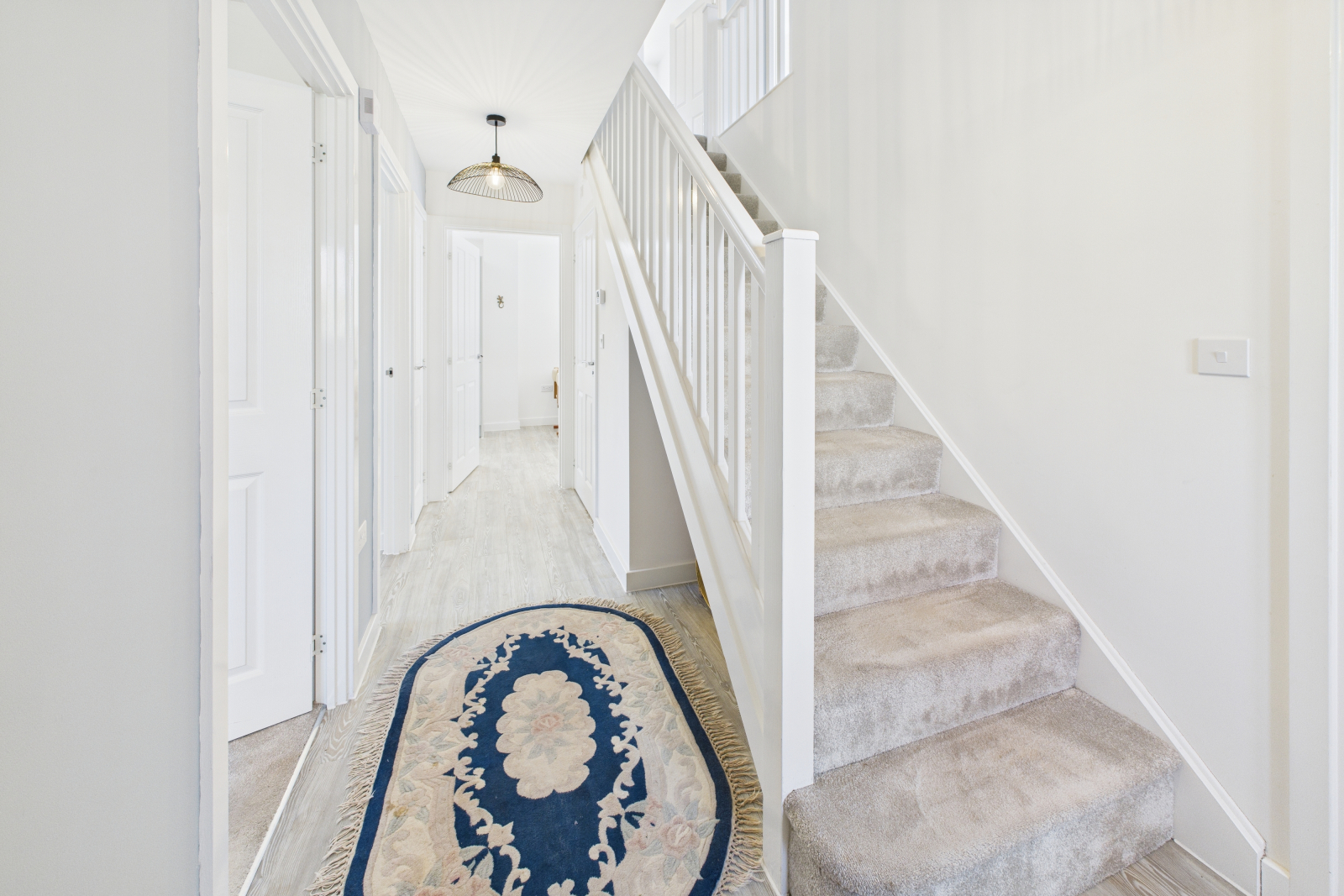 Step into a light and inviting hallway with wood-effect flooring and a soft, neutral palette that immediately feels like home. A carpeted staircase gently curves to the first floor, while doors lead to the main living areas. There’s thoughtful space for coats, shoes and family essentials, along with a large fitted cupboard housing the solar panel controls and internet hub—tidy, practical, and future-ready.
