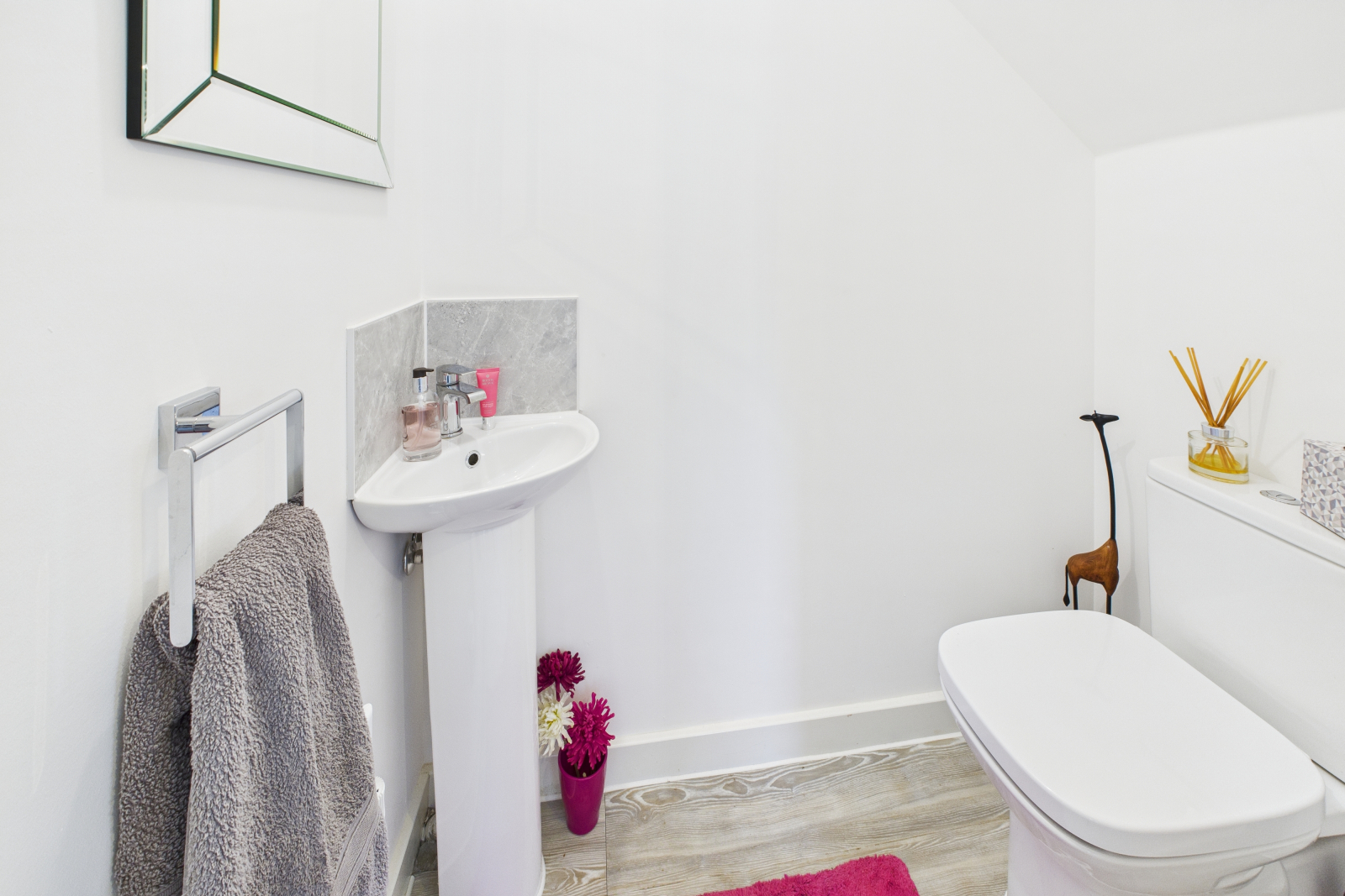 A well-placed and stylish downstairs WC, featuring a modern suite with chrome fittings, tiled splashbacks, and wood-effect flooring—ideal for guests and everyday convenience.