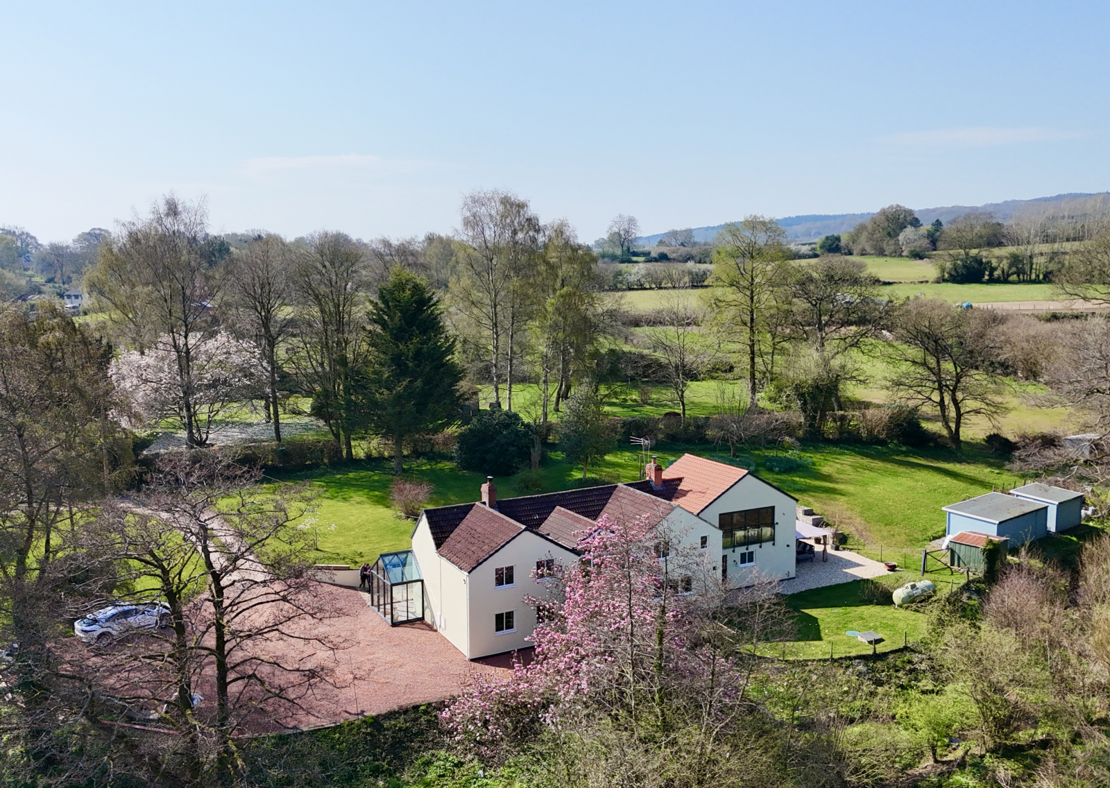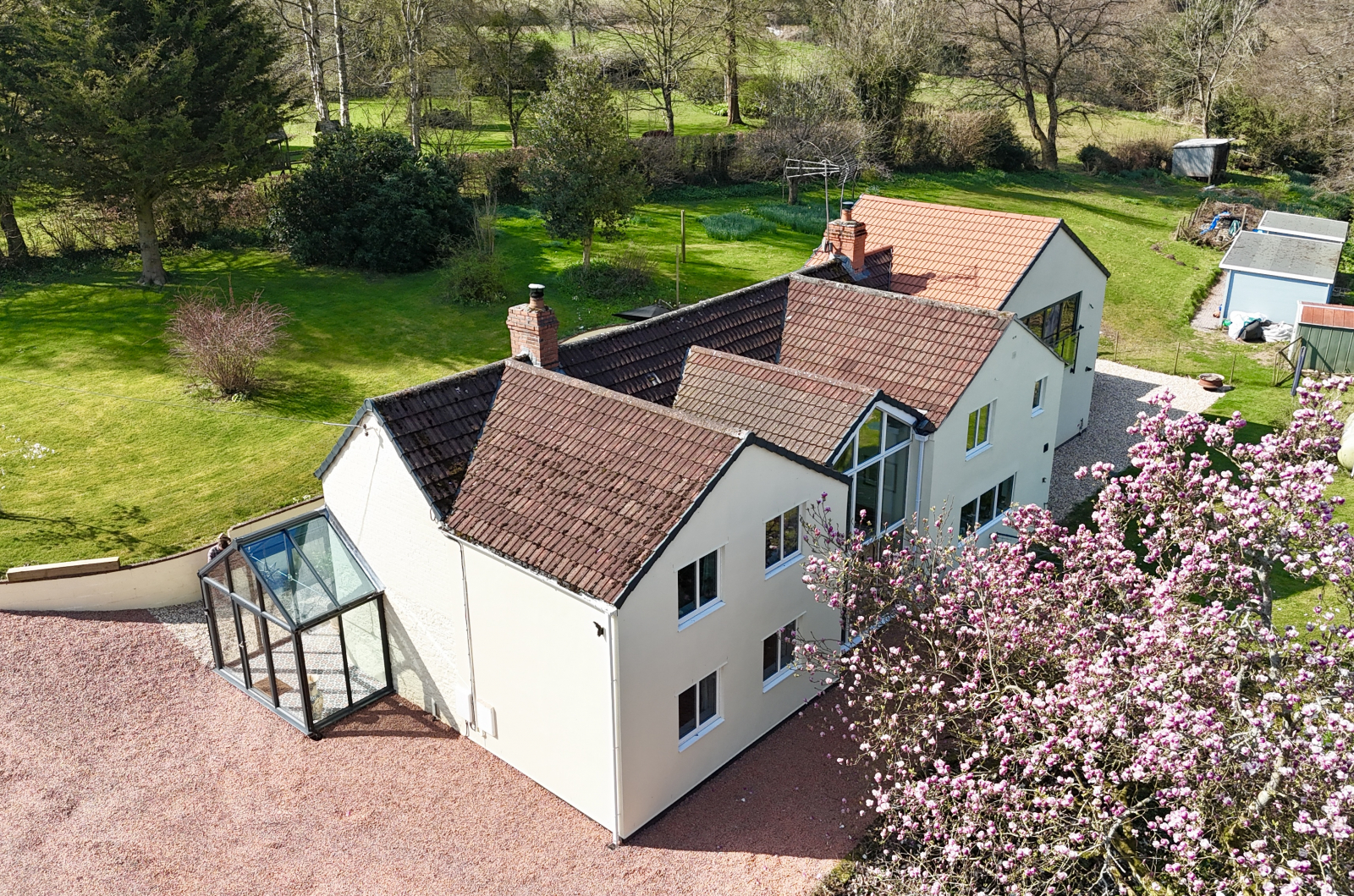 Set within approximately 2.5 acres, the grounds offer a sublime escape into countryside living. Manicured lawns wrap around the home, framed by mature trees and vibrant seasonal planting that brings colour and texture throughout the year.