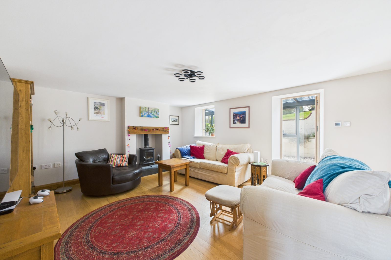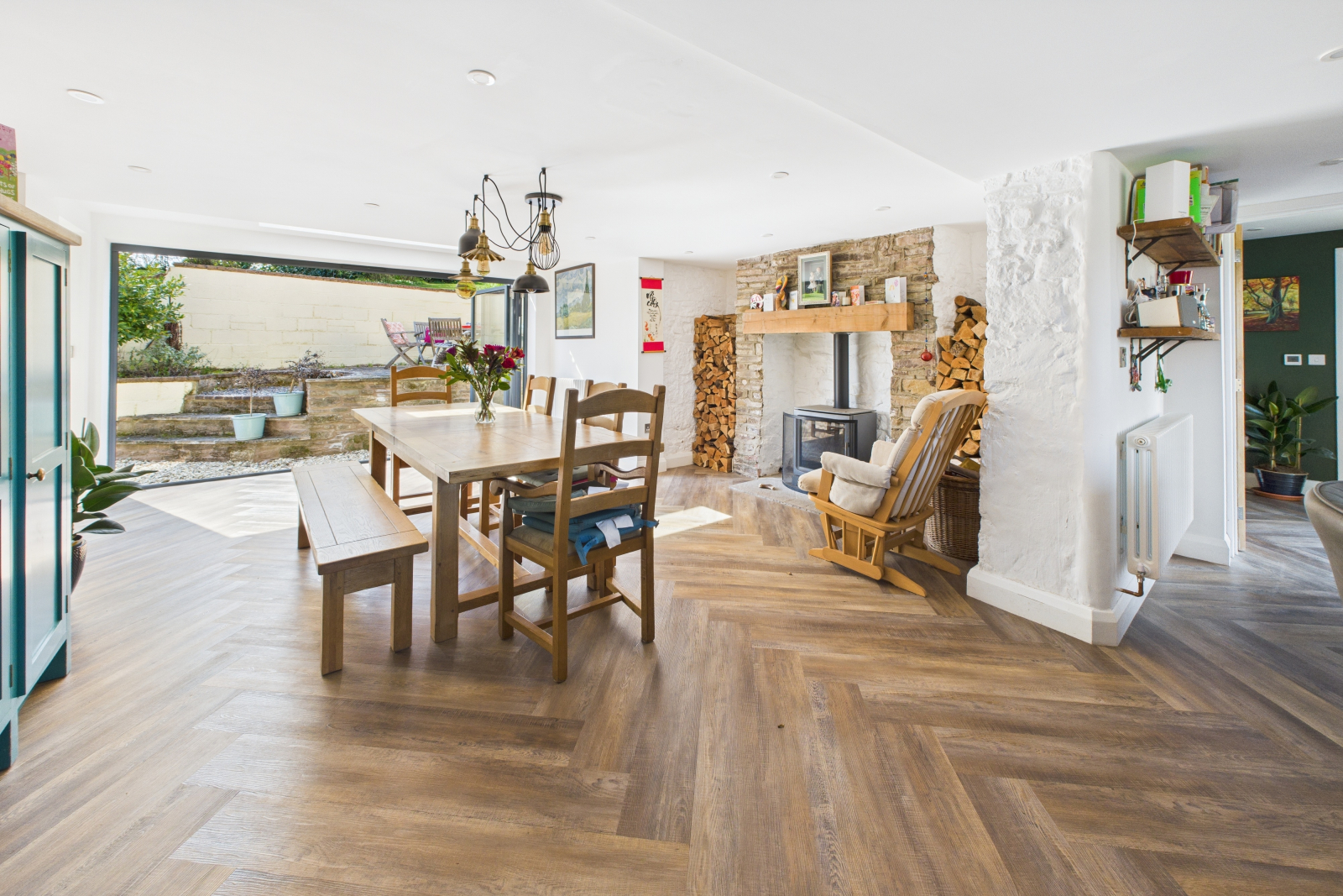 The bespoke kitchen, rich in detail and premium finishes, is both a culinary haven and a statement of style. A striking fireplace with a wood-burning stove adds intimate warmth, while full-width bifold doors extend the space into an enchanting courtyard perfect for family get togethers or summer elfreso dining.