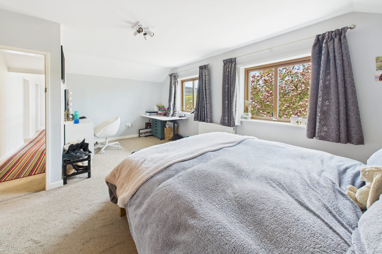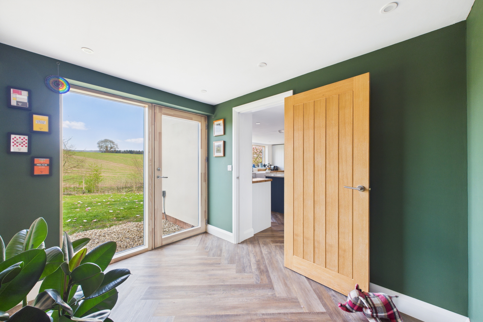 Ascending to the first floor, you’re greeted by a magnificent, bespoke glazed atrium that frames a beautiful magnolia tree against the serene rural backdrop. This luminous landing sets the tone for the upper level’s quiet elegance.