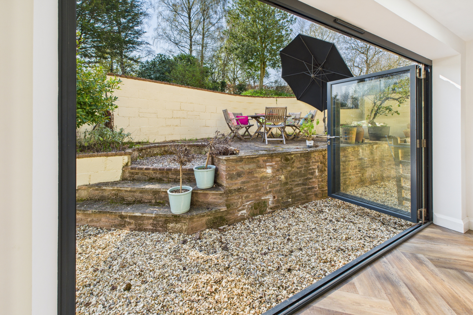 A meticulously designed utility room connects seamlessly to the lush garden, with further bifold doors opening onto a private seating nook, ideal for morning coffee or a quiet afternoon read. A charming traditional pantry, dedicated wine room, and sleek contemporary shower room underscore the home’s rare blend of practical luxury and aesthetic charm.