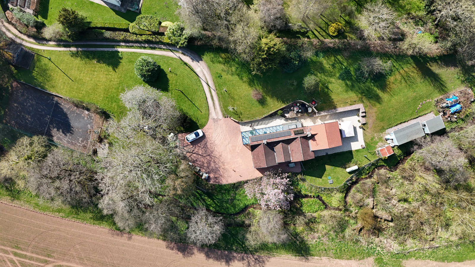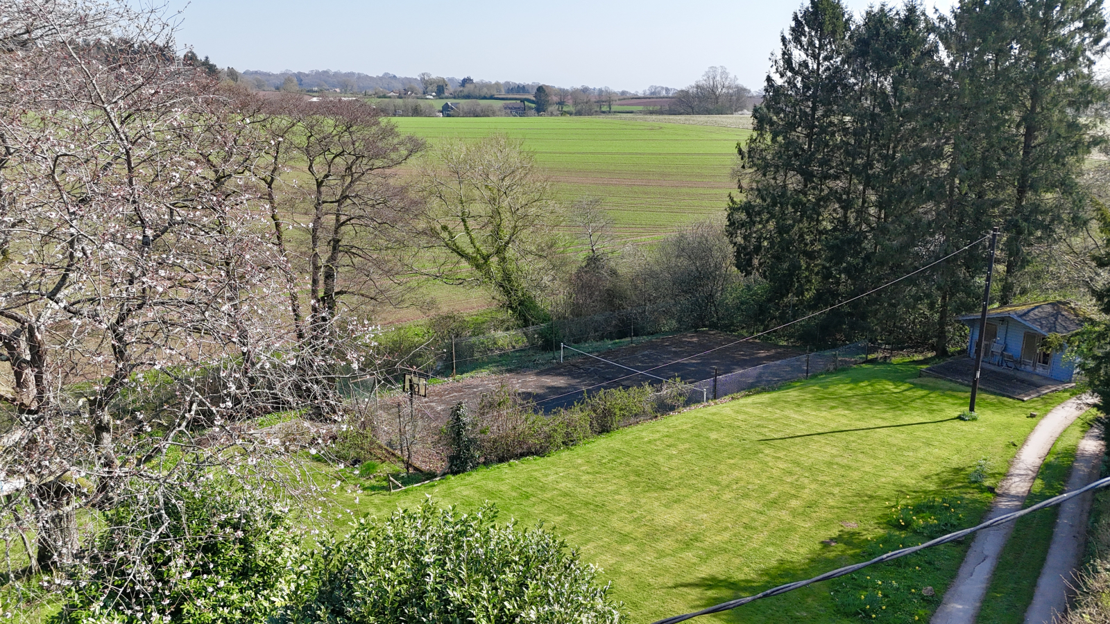 A long, sweeping driveway meanders through the grounds to a generous parking area, providing a picturesque approach to the property. Within the garden, lifestyle and leisure are beautifully catered for, with a tennis court, a delightful children’s treehouse, and multiple courtyard seating areas perfect for entertaining or quiet enjoyment.