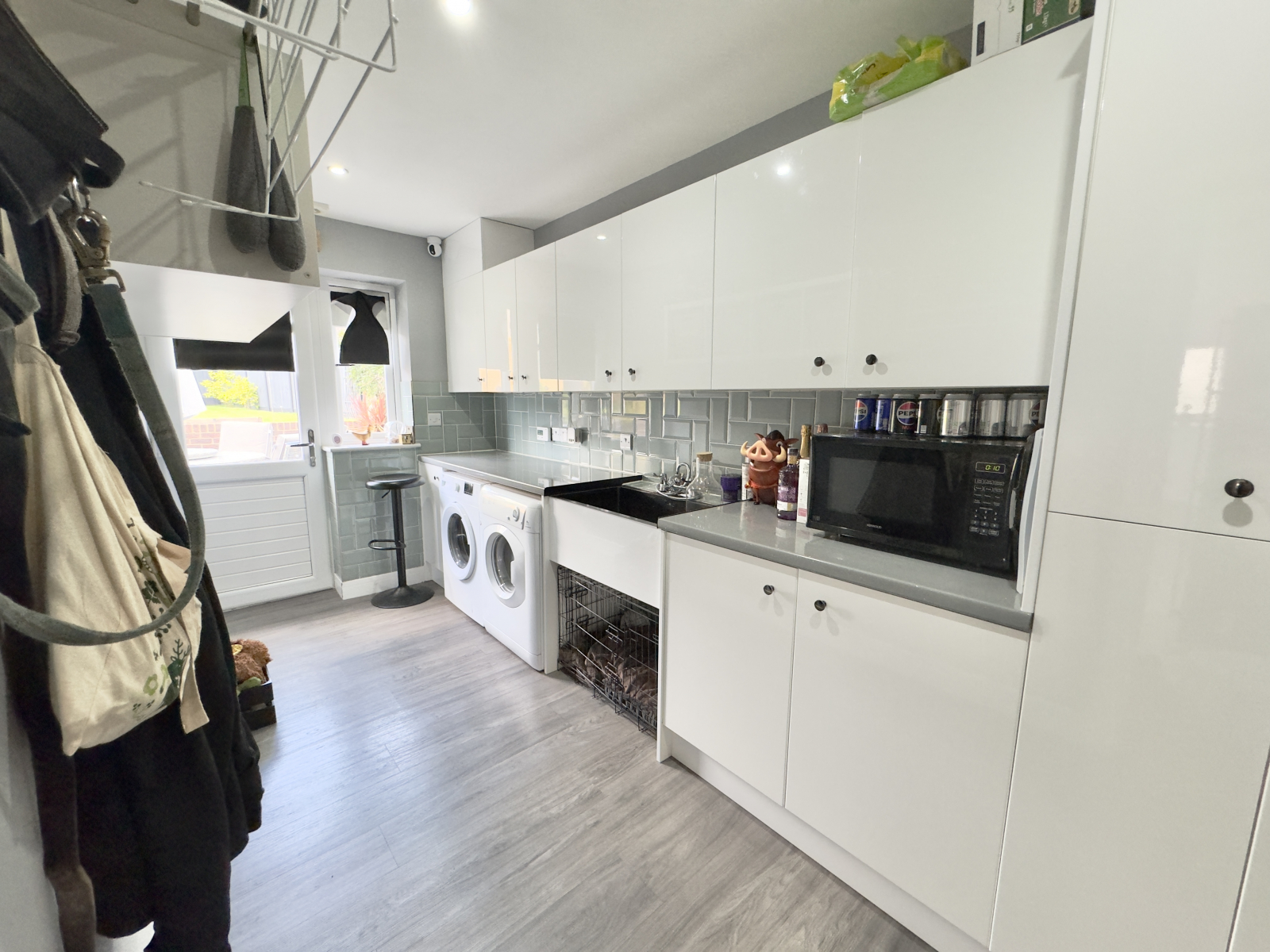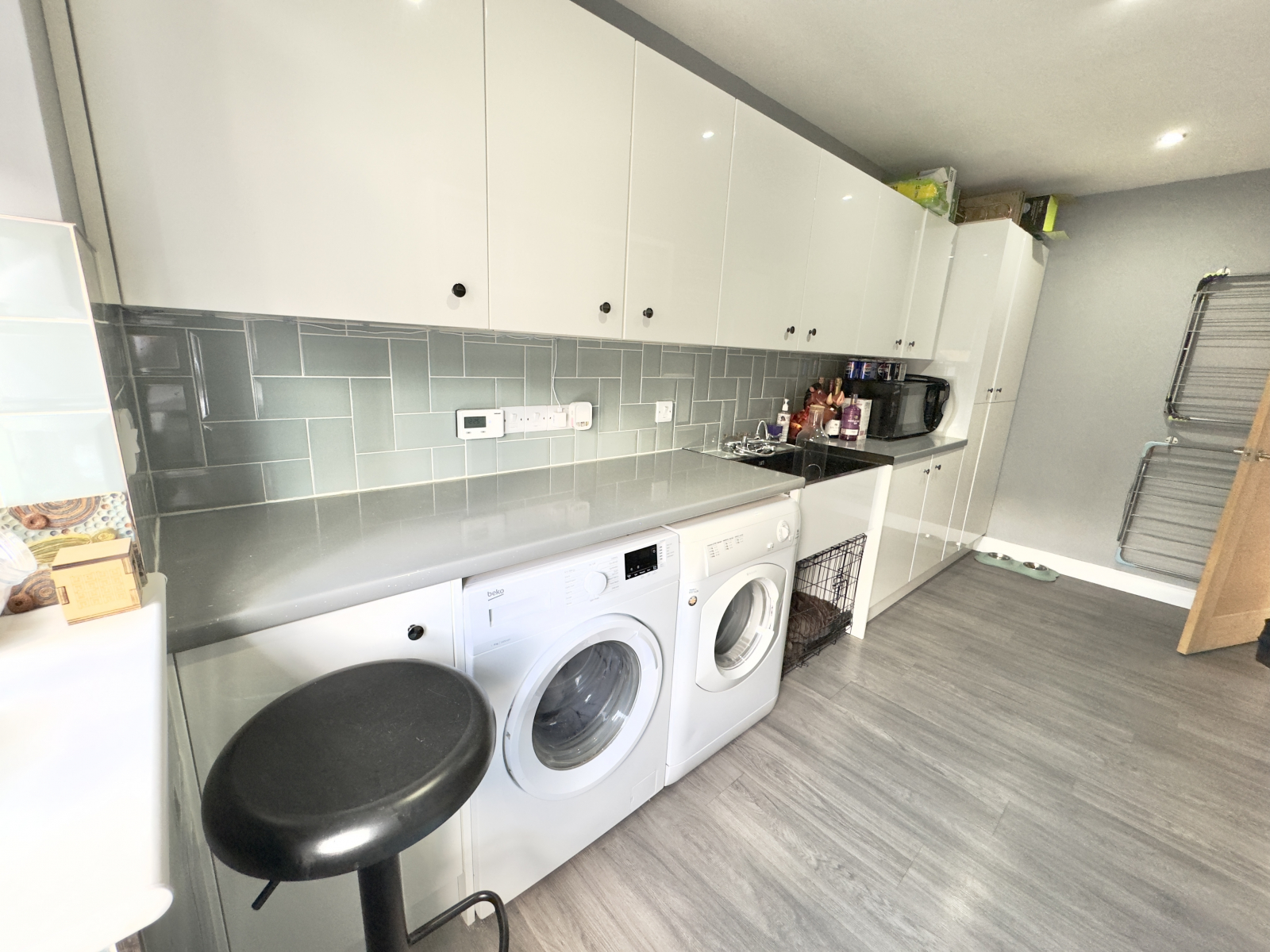 UPVC half glazed door giving access to the garden and UPVC double glazed window. Great range of high gloss cabinets and rolled top work surfaces with tiled splash backs. Space for washing machine and tumble dryer with large sink having mixer tap with shower attachments. Spot lighting and wood effect flooring. Modern radiator and extractor fan.