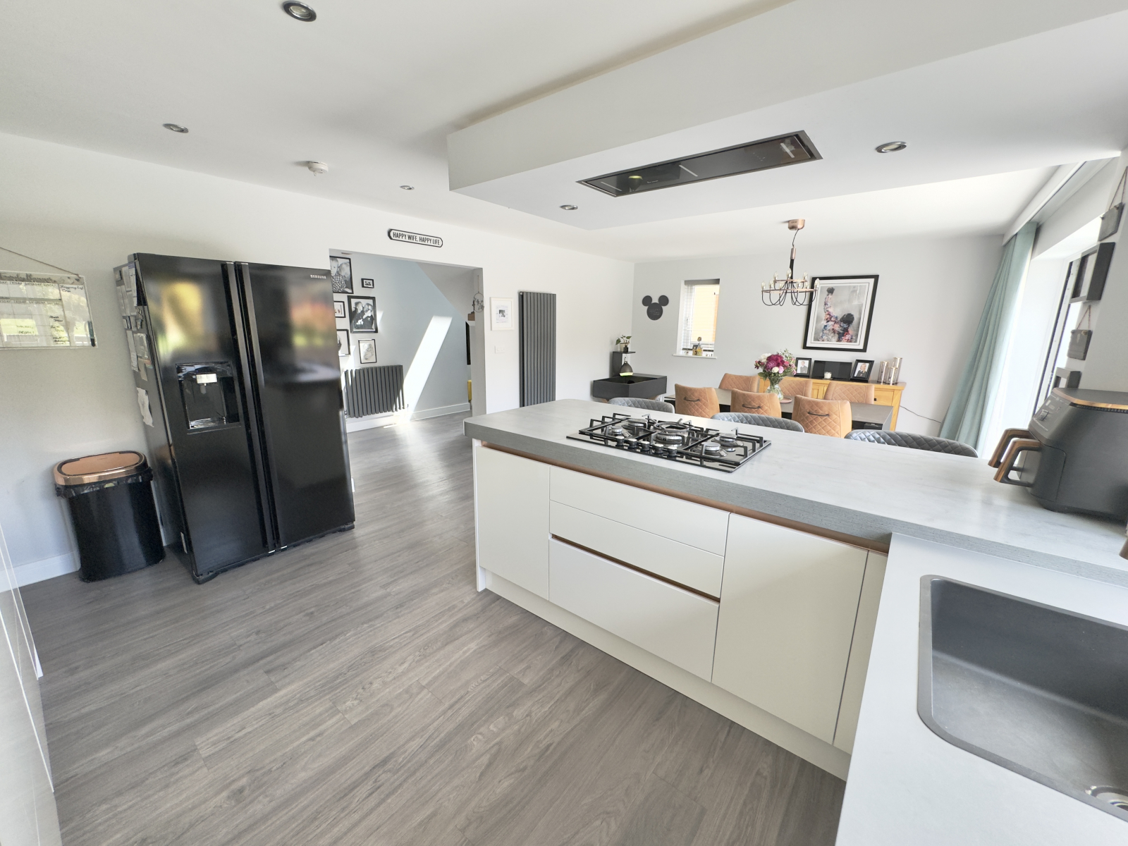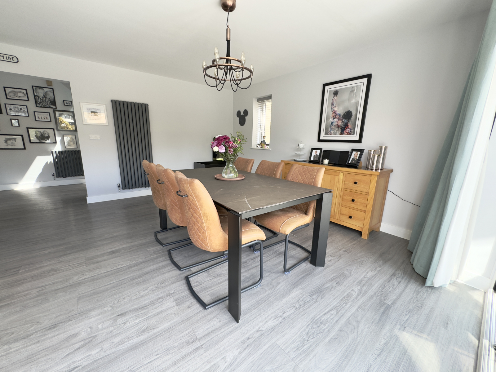 Dining area with central feature lighting and wood effect flooring. Space for a large dining table and modern vertical radiator. Range of power points.