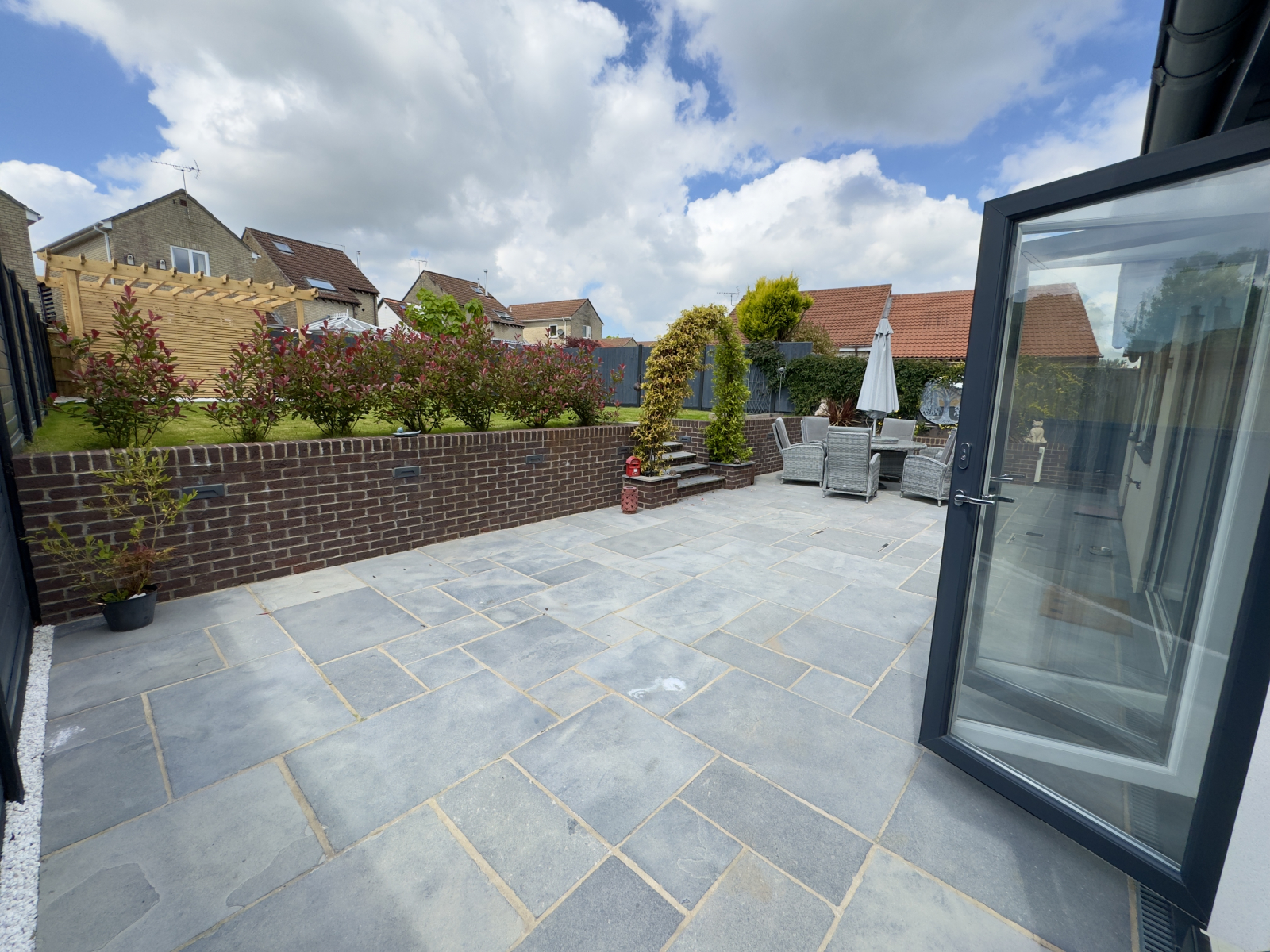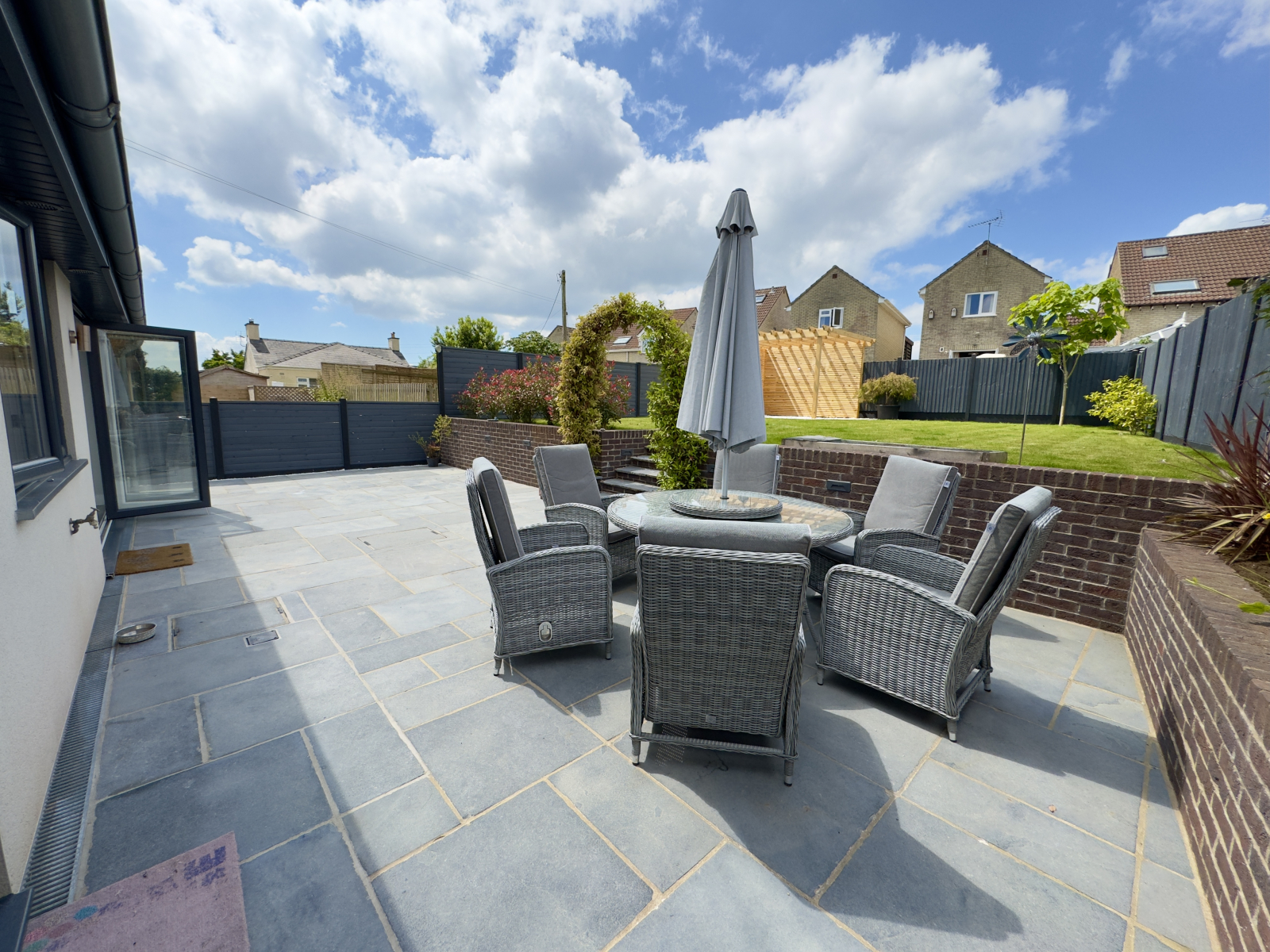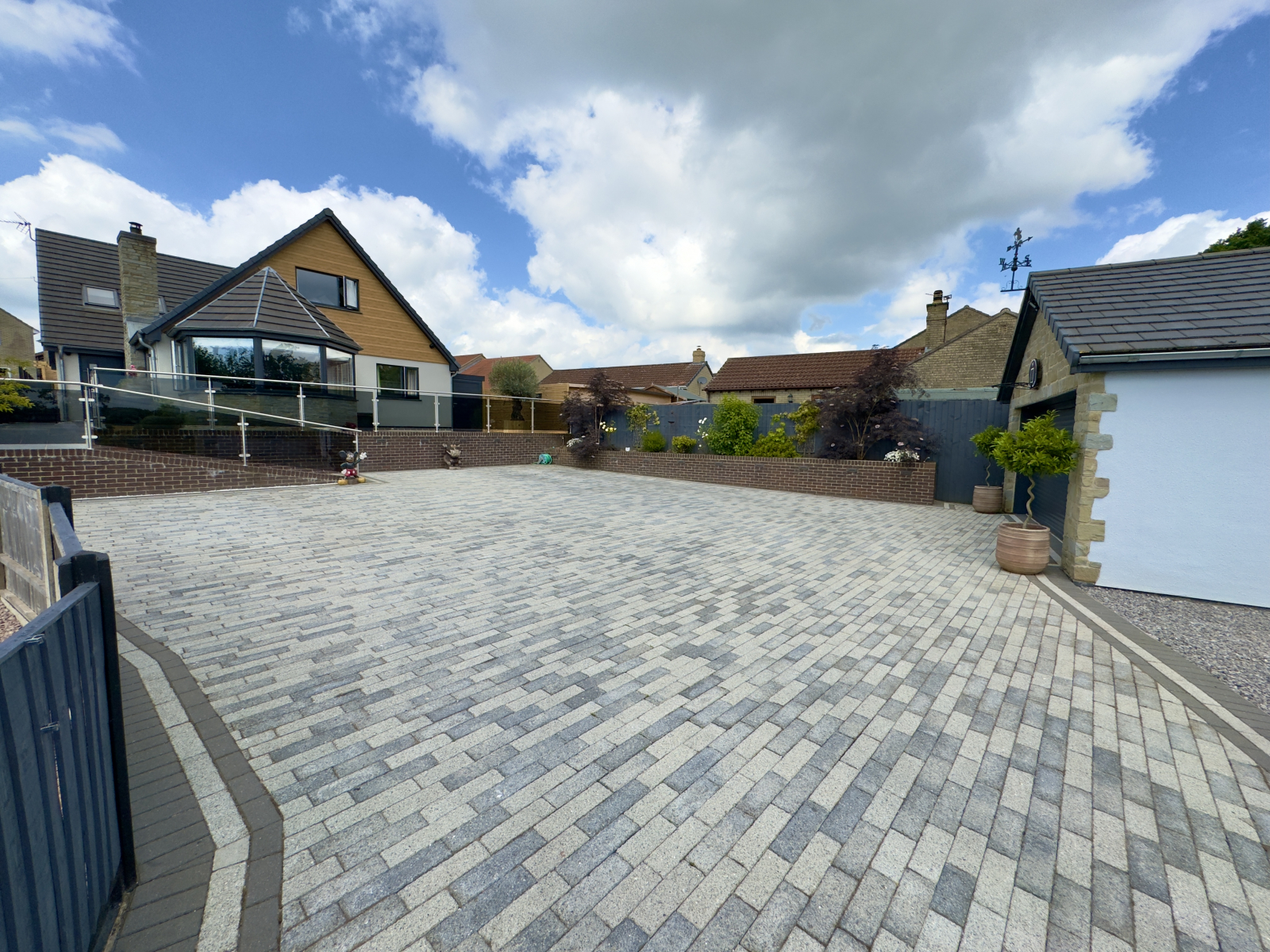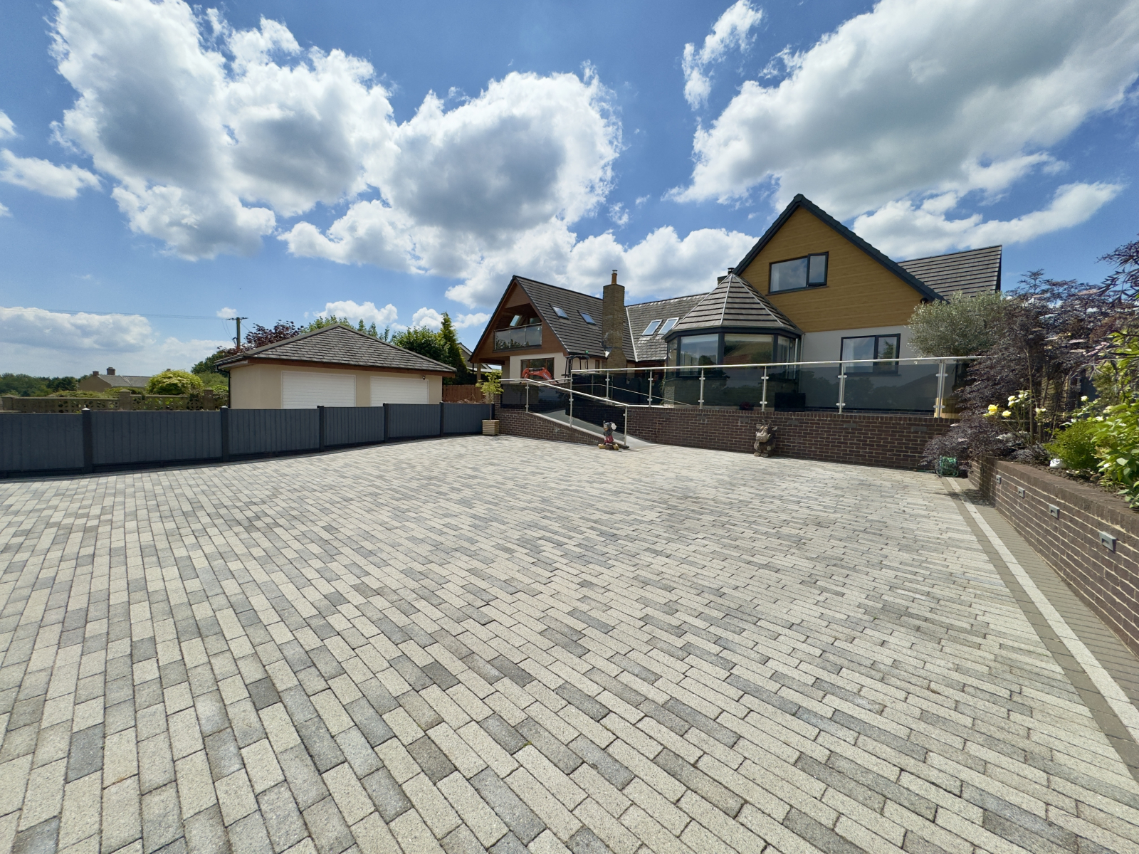 To the front the property is an exceptionally large paved driveway providing an abundance of parking. Having walled and fenced boundaries with charming raised flowering borders. Access to woodstore and storage shed. Glass balustrades and paved pathways lead to the front of the property and give access to a fabulous paved balcony terrace. Gated secure access via both sides of the property.