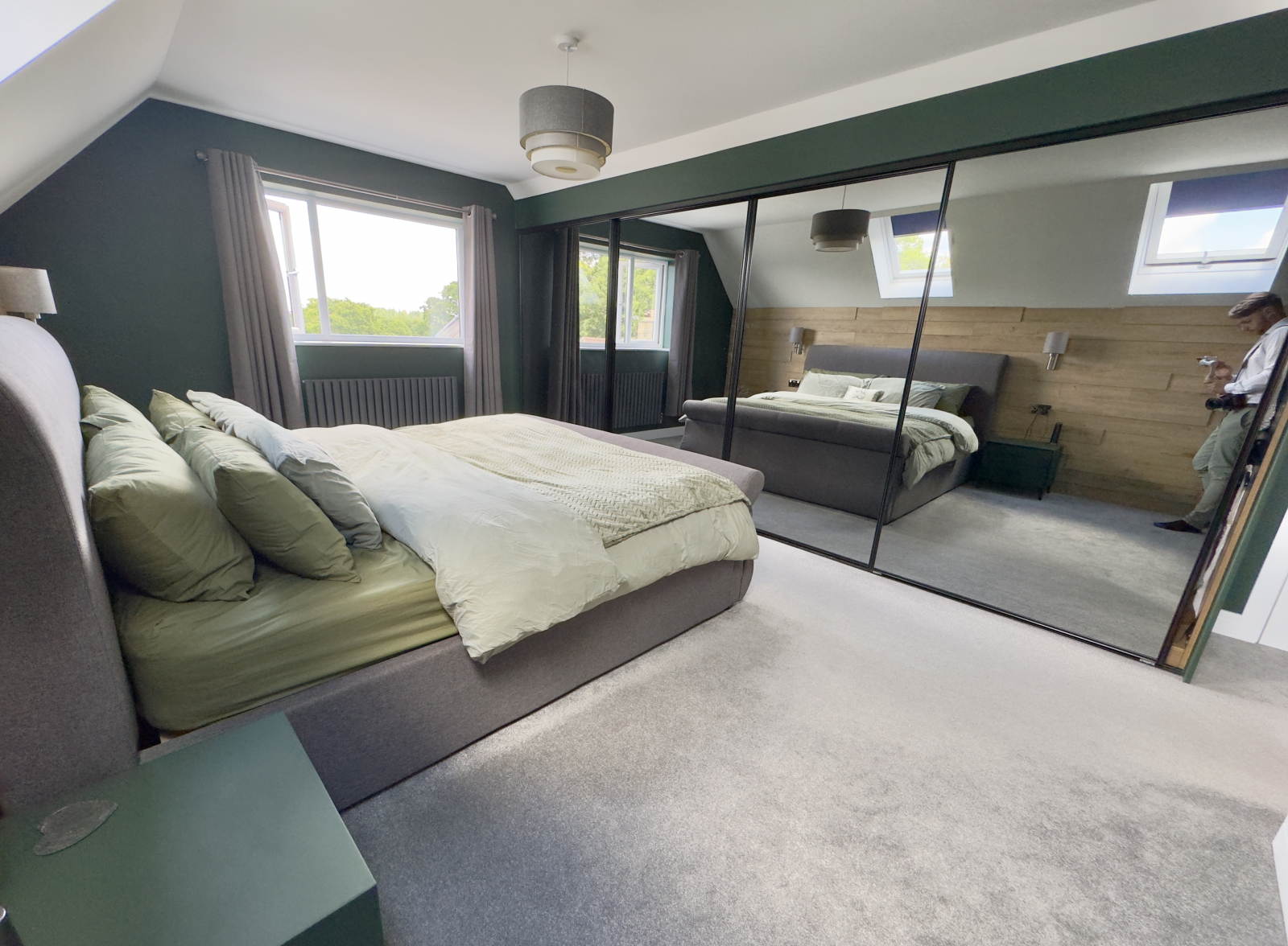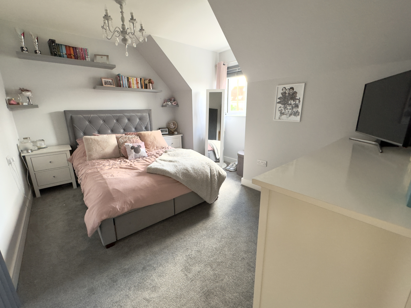 UPVC double-glazed window to the front aspect with exceptional rural outlook. Two large sky lights bring in an abundance of natural light. Feature wooden cladding and bespoke fitted mirrored wardrobes with an abundance of storage and hanging rails. Power point for TV. Carpeted throughout with feature wall lighting and central ceiling light. Range of power points.
