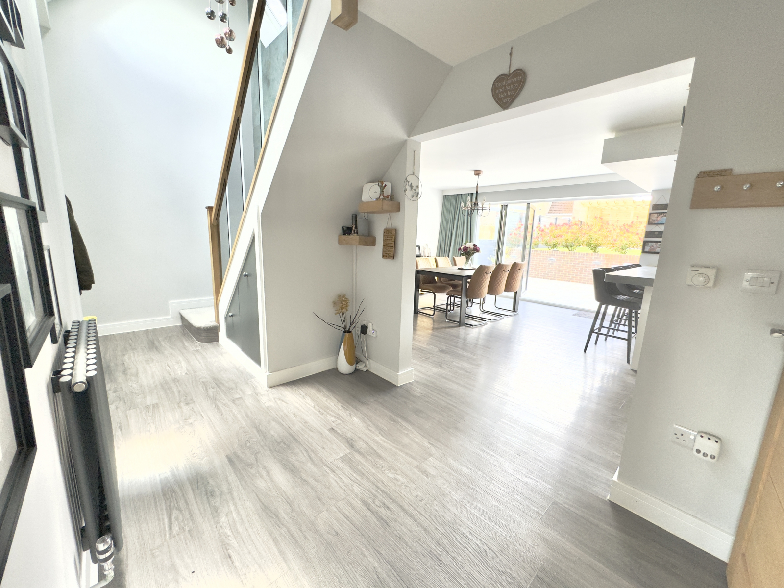 This outstanding hallway really has the wow factor. Wood effect flooring throughout with vaulted ceilings having feature tiled wall and sky lights. Carpeted stairwell to the first floor with glazed oak ballustrade and beautiful central lighting. Understairs storage space modern radiator, central heating controls and power points. Doors leading off and archway into Kitchen / Diner.