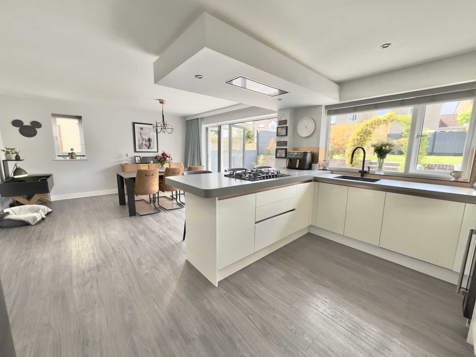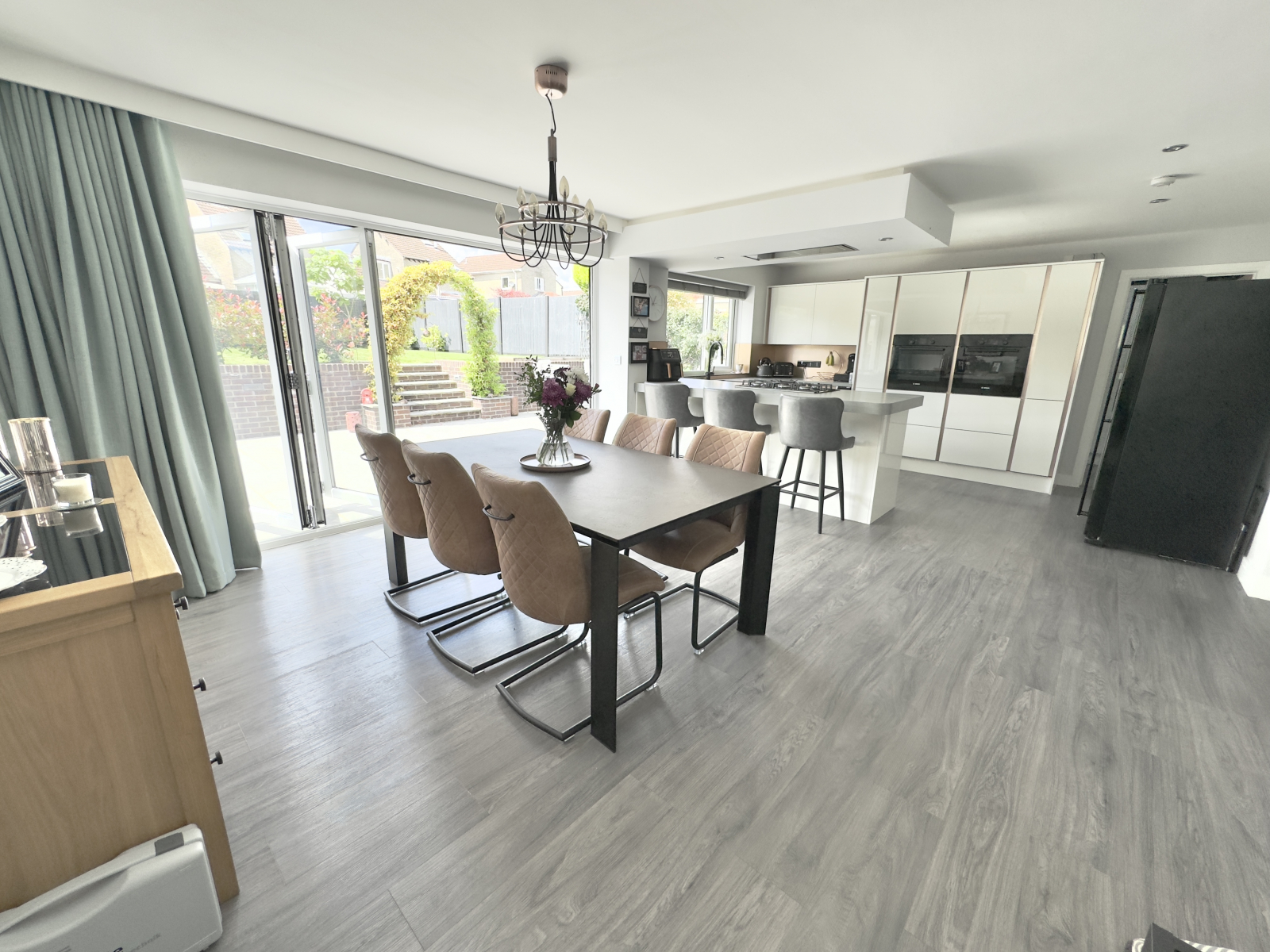 This truly outstanding and immaculately presented room is the heart of this fantastic home. Having UPVC double-glazed bi-folding doors to the garden and large UPVC double-glazed windows to rear and side aspects. Excellent range of fitted high gloss kitchen units and drawers with soft close and rose gold highlights. Grey worksurfaces and rose gold splash backs. Two eye level Bosch integrated ovens and pantry style cupboards. Integrated wine cooler and dishwasher. Five ring gas hob with integrated extractor above. Composite modern sink with mixer tap. Feature undercabinet lighting and spot lighting. Space for American style fridge/ freezer, breakfast bar area and range of power points. Wood effect flooring throughout and open into the dining area.